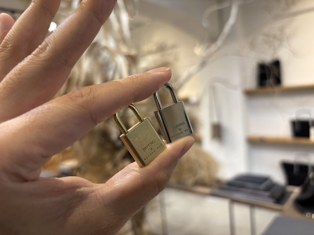 The leather parts are made from leftover scraps from bag production, and the combined lock features the PAYUNG × Maison Def double name. The asymmetrical design makes it truly one of a kind.