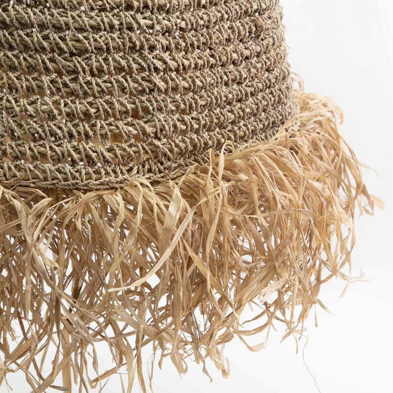 ラフィアはラフィア椰子の葉を乾燥させた繊維のこと。柔軟性があり軽量で丈夫なのが特徴です。最近ではバッグや帽子などでよく使われているのを見かけます。ランプシェードとしては大きさのわりに1.4kgと軽いので天井から吊るす時も負担が少なく取り扱いし易いのが特徴です。