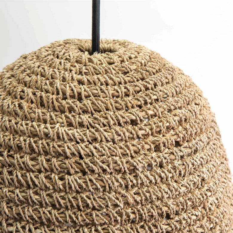 天然素材のラフィアを使用したこちらのランプシェードは、網目からこぼれる柔らかな光が表情豊かで印象的。
