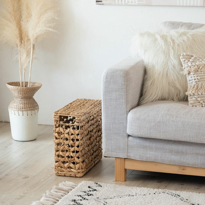 雑誌や新聞などを入れてソファーのサイドに置いておくとスッキリと見えて、ちょっとしたサイドテーブル代わりにもなりそう♪