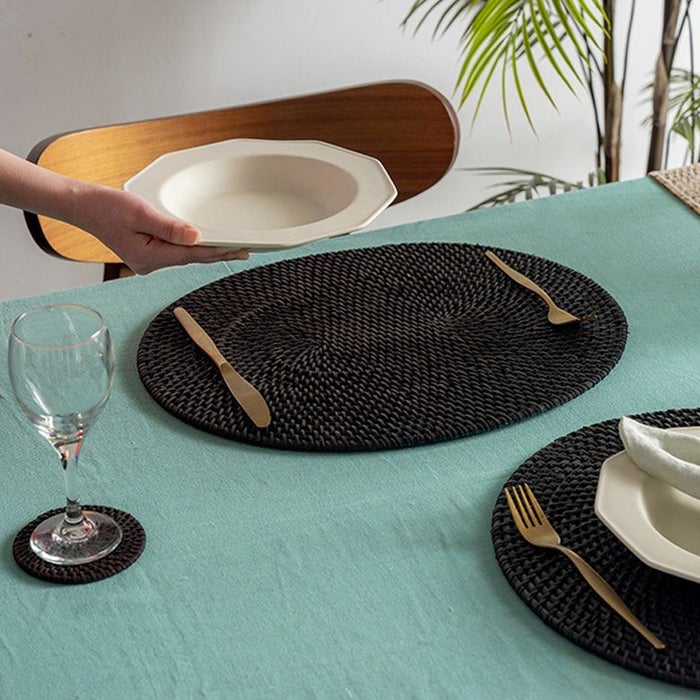 こちらのプレイスマットは天然素材のラタン(籐)を編みあげ、こっくりとした炭黒に染め上げたもの。