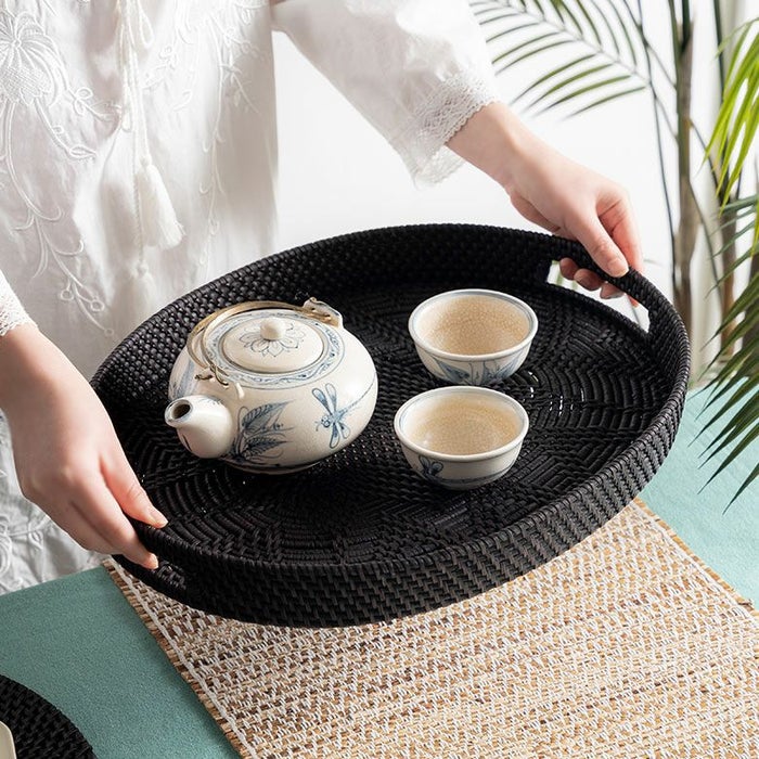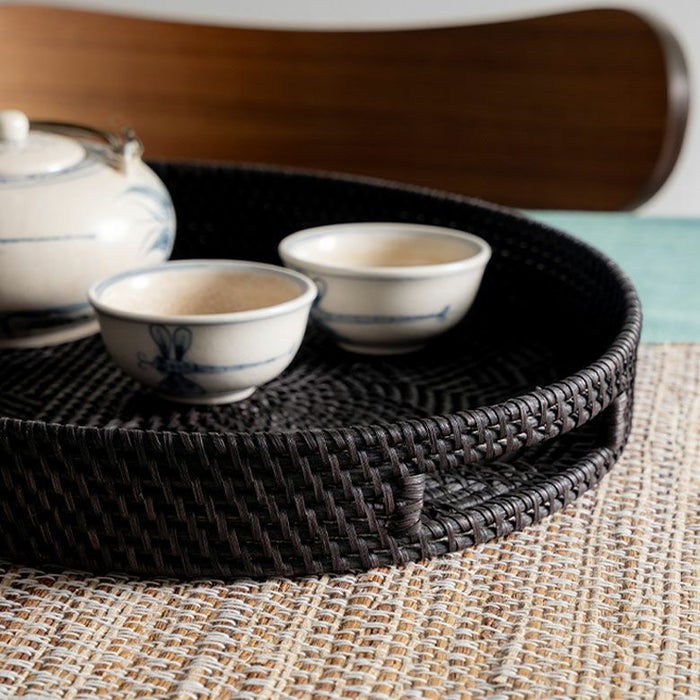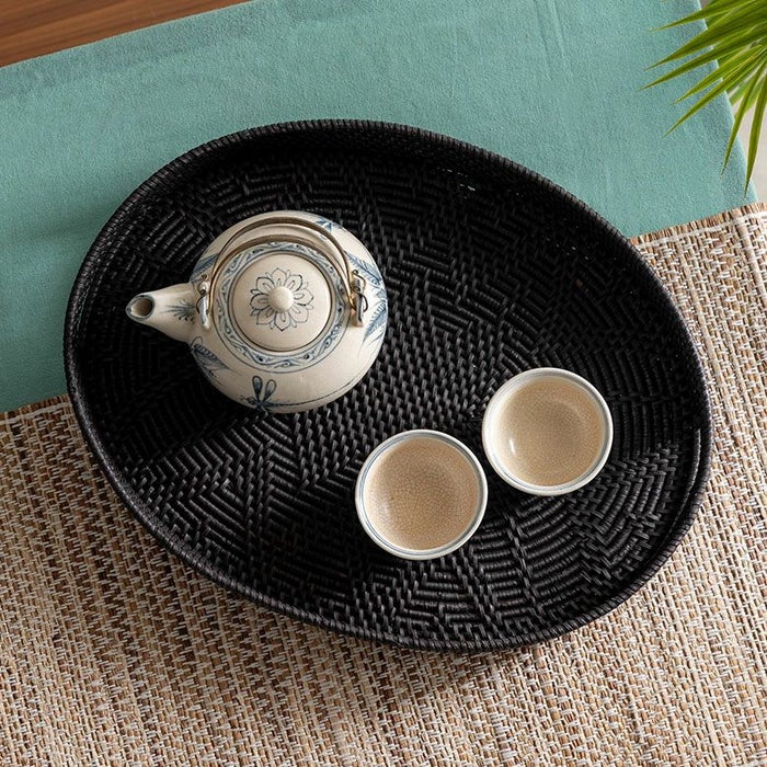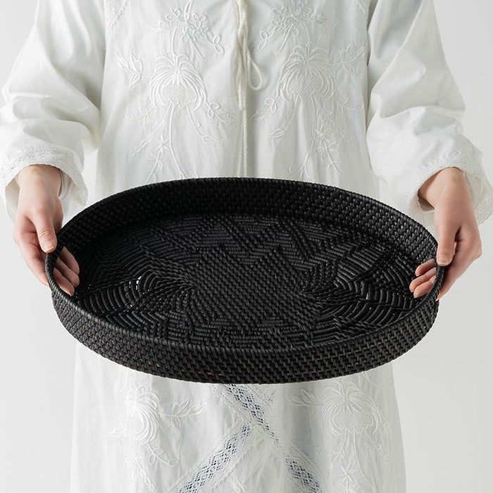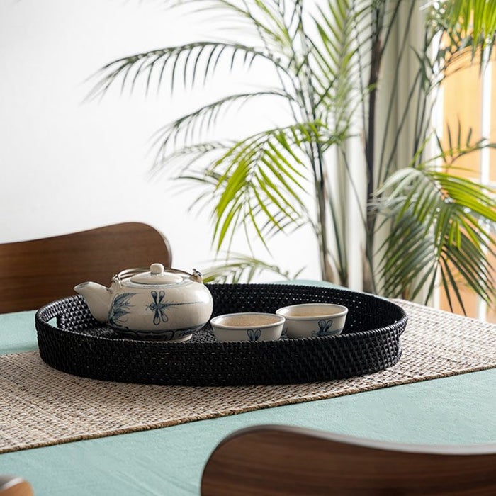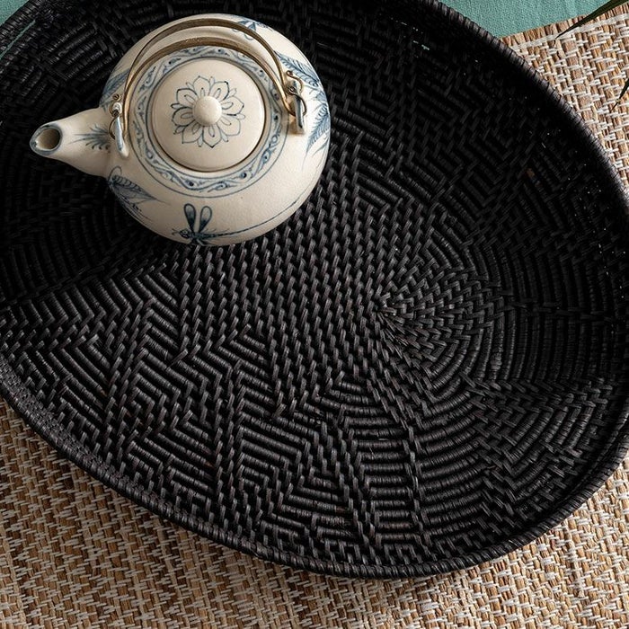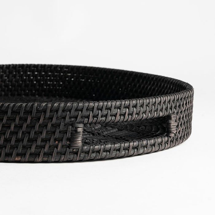 こちらのオーバルトレイは天然素材のラタン(籐)を編みあげ、こっくりとした炭黒に染め上げたもの。
