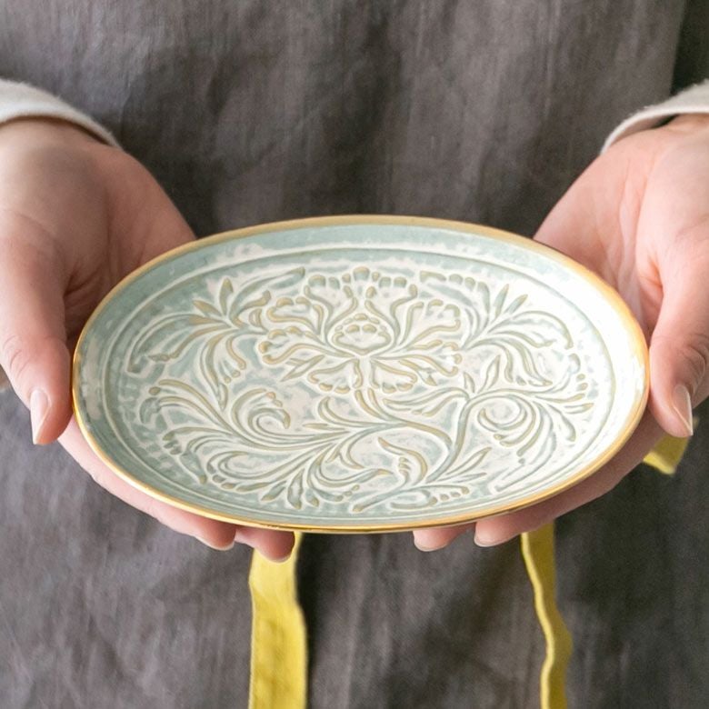 他の画像を見る 灰白色の優しい色合いとゴールドが品よくエレガントな器 【有田焼】花唐草彫り 楕円皿 ハクア 16㎝ made in JAPAN BESTSELLER ¥ 2,530 税込 カートに入れる お気に入り