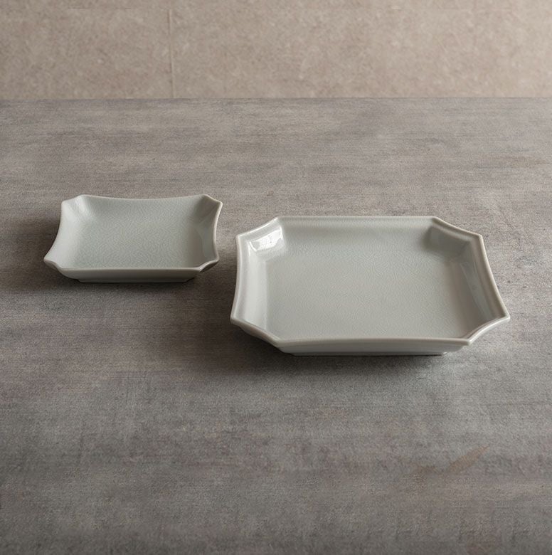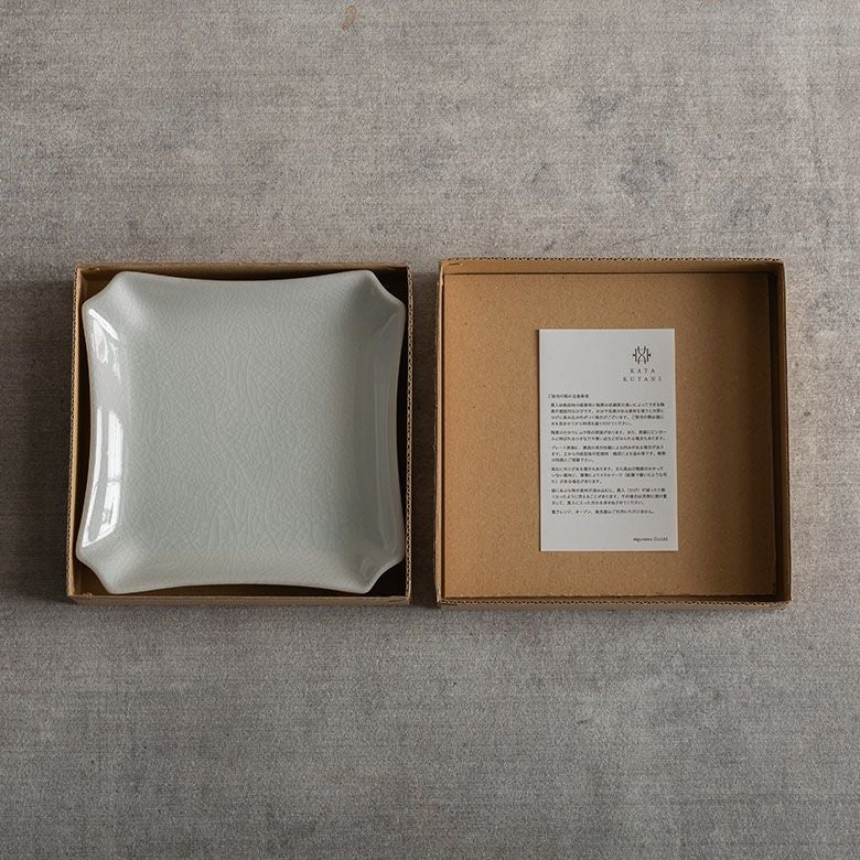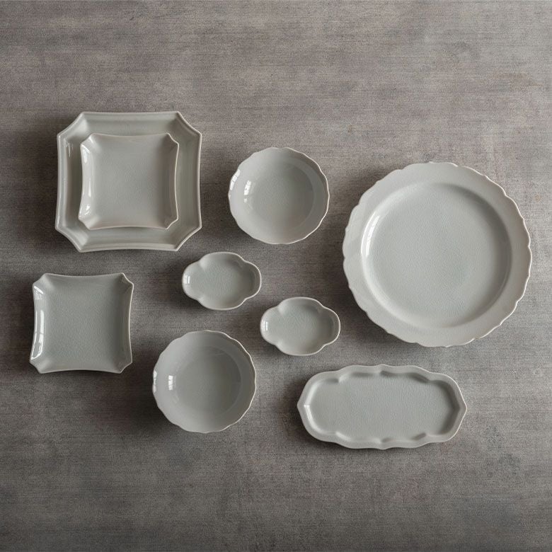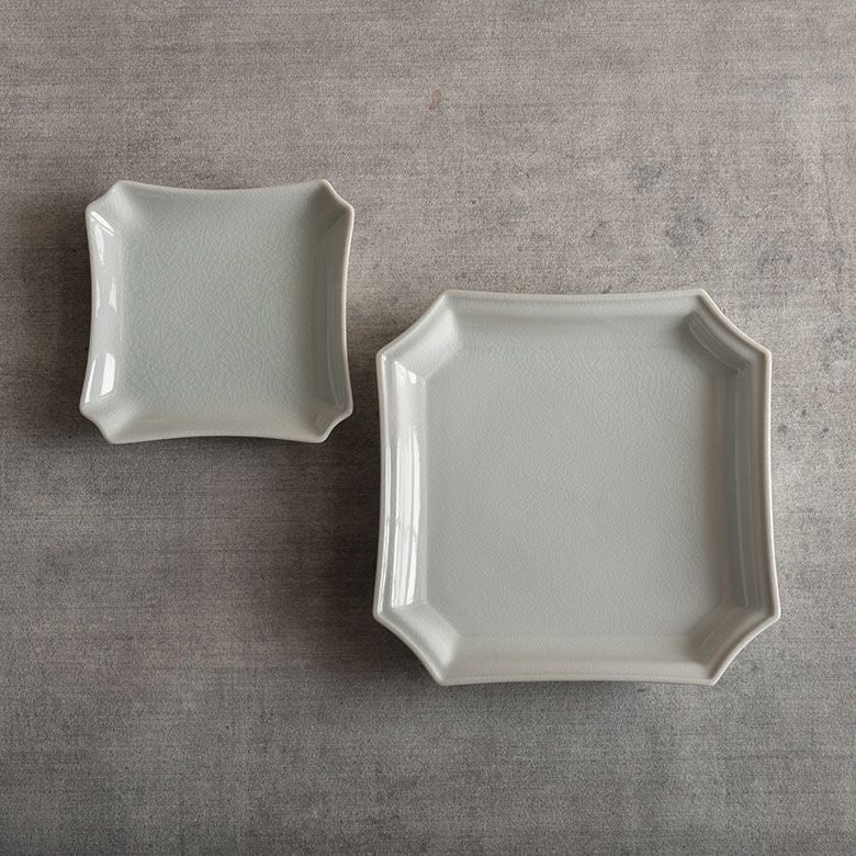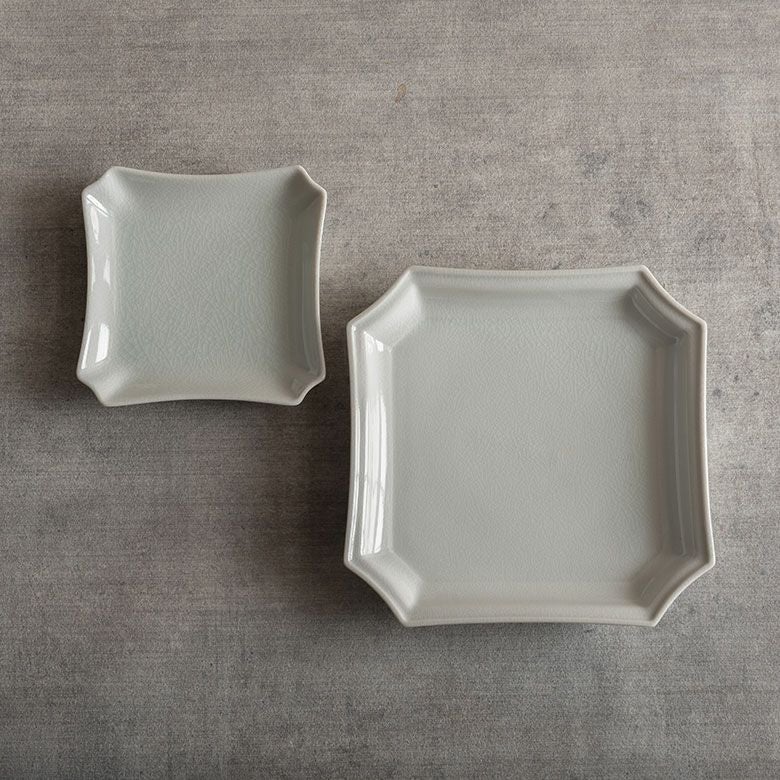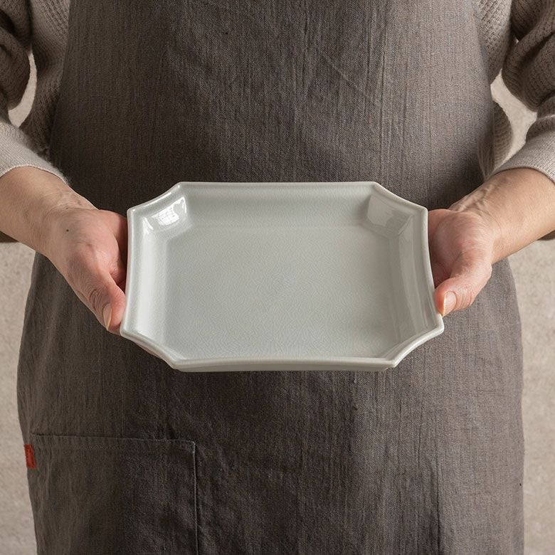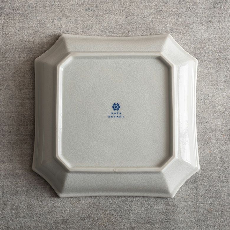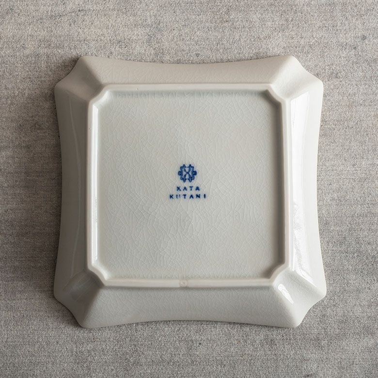 窯元の型から生まれた隅切角、ツバ型、桔梗など昔ながらの形を、絵を入れない釉に細かいひびの入った「貫入」だけにすることで豊かな表情と落ち着いた雰囲気のあるラインに仕上がりました。伝統とモダンさを合わせもった新しい九谷焼がこの型九谷です。