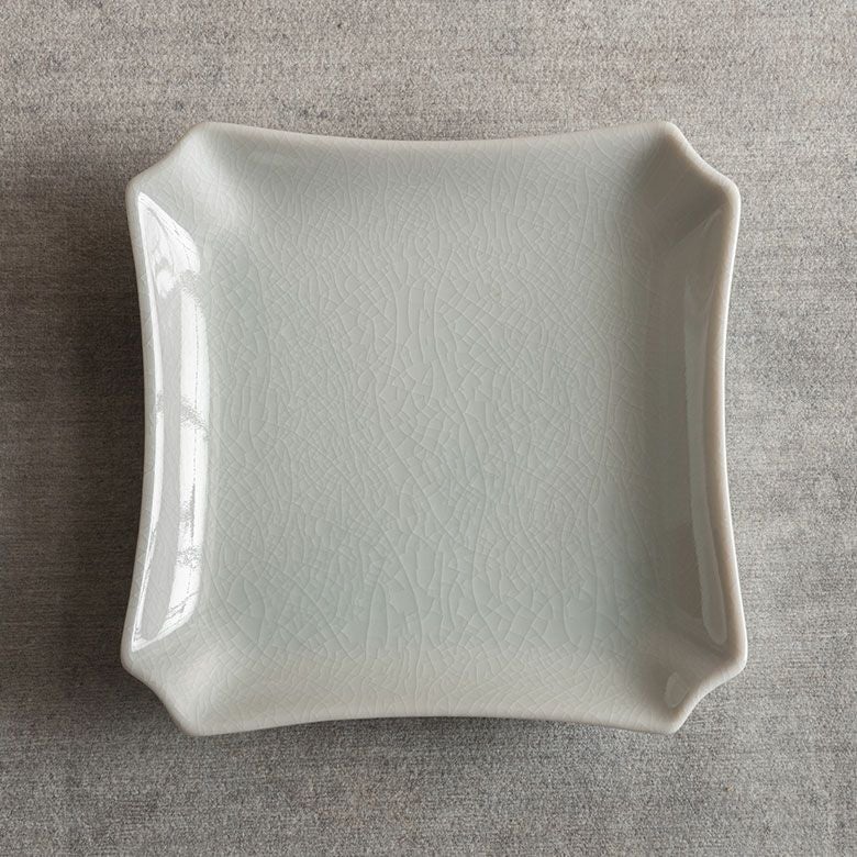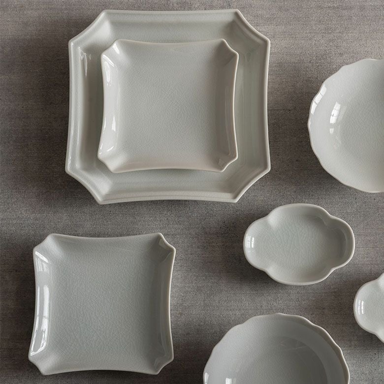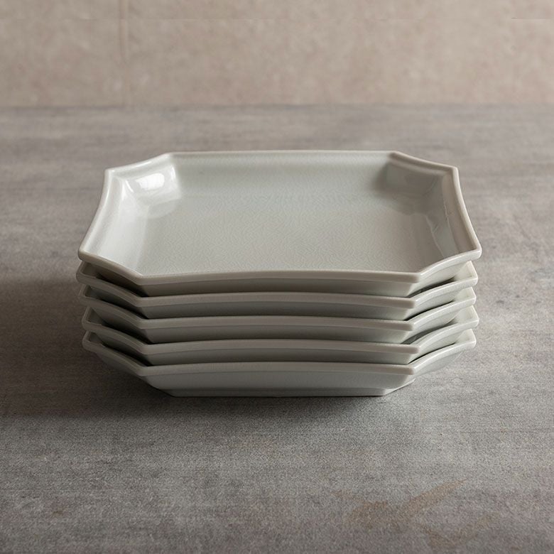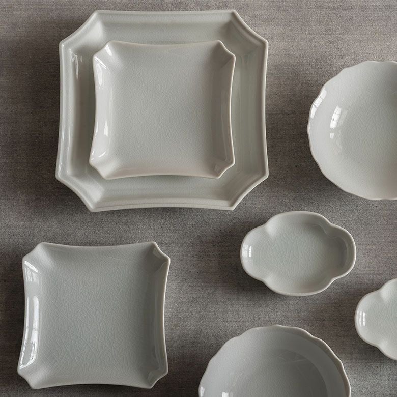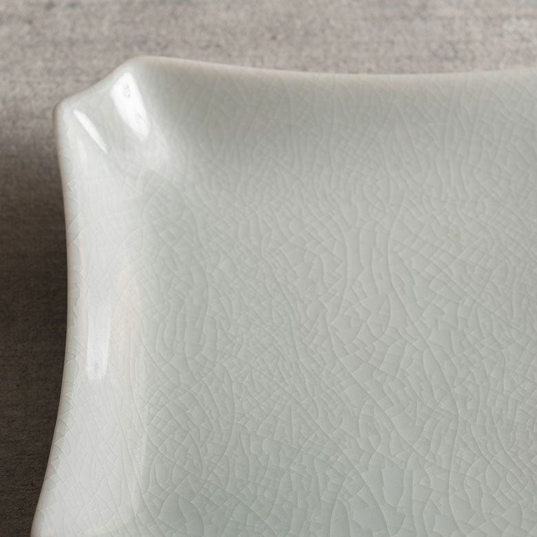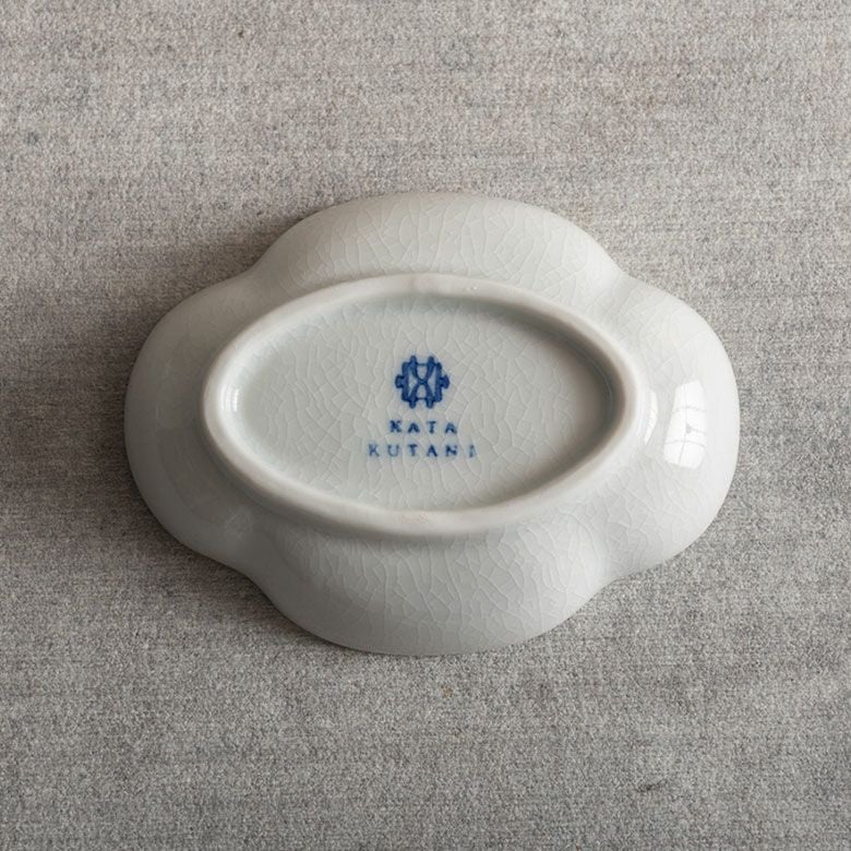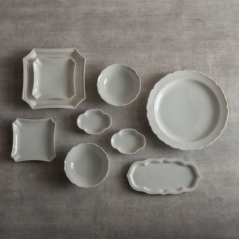 窯元の型から生まれた隅切角、ツバ型、桔梗など昔ながらの形を、絵を入れない釉に細かいひびの入った「貫入」だけにすることで豊かな表情と落ち着いた雰囲気のあるラインに仕上がりました。伝統とモダンさを合わせもった新しい九谷焼がこの型九谷です。