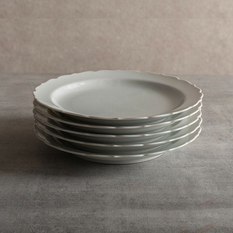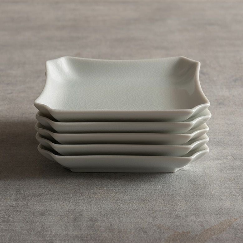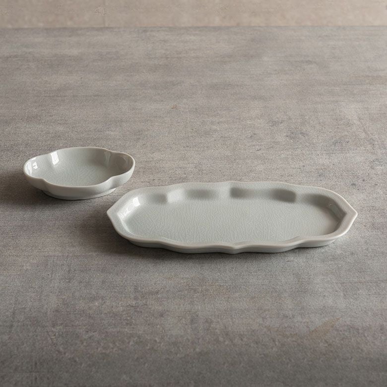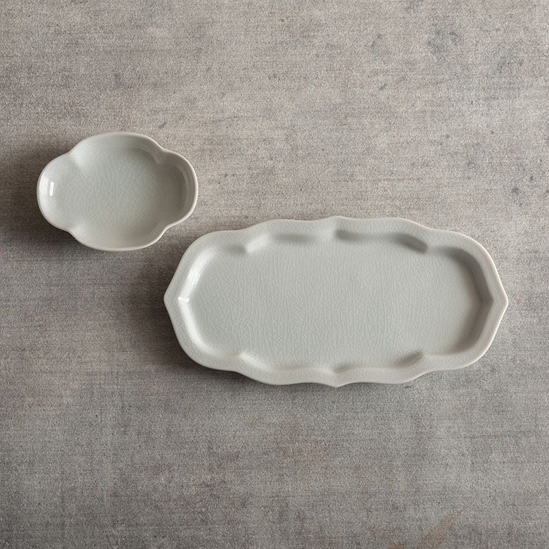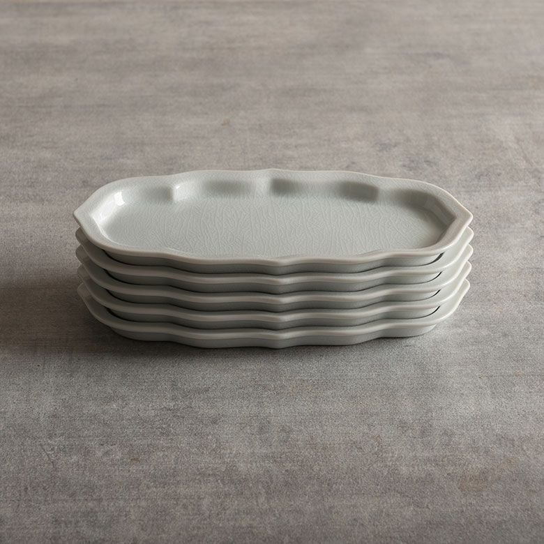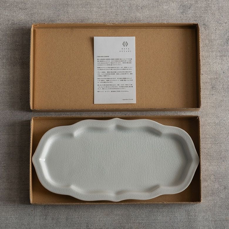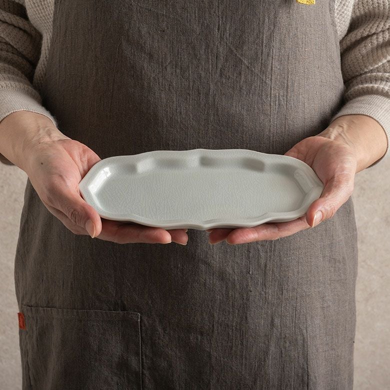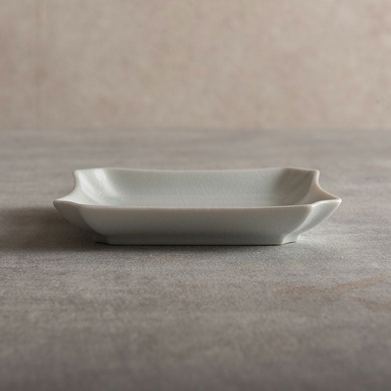 窯元の型から生まれた隅切角、ツバ型、桔梗など昔ながらの形を、絵を入れない釉に細かいひびの入った「貫入」だけにすることで豊かな表情と落ち着いた雰囲気のあるラインに仕上がりました。伝統とモダンさを合わせもった新しい九谷焼がこの型九谷です。