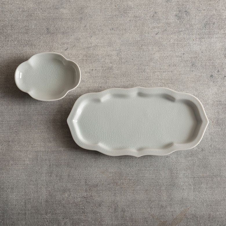 柄がない分、形の美しさに目がいき、何より和食器でありながらフランスのアンティークのような陰影があり、カヌレやフィナンシェなどの洋菓子を載せてもしっくりくるのです。