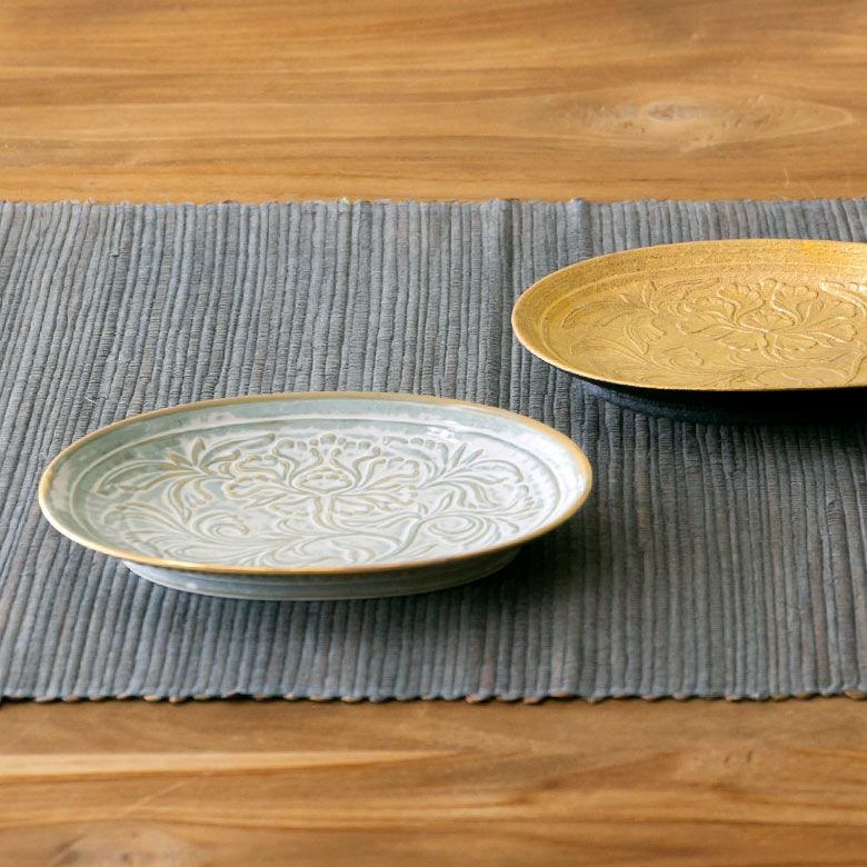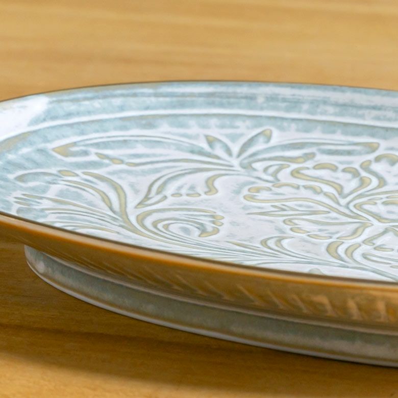 焼き物の街として有名な九州・有田で作られているこちらの器は、「ハクア」という灰白色(かいはくしょく)と呼ばれる、灰色を帯びた白色です。この優しい色の器は、当店でも特に人気の色。焼け具合によって色の出方が異なる釉薬を使っており、一枚一枚に個性が表れるのが魅力です。このハクアからちらりと覗く縁の金色が、とても上品でエレガント。花唐草という名前の通り、曲線で描かれた模様がそのハクア色をより美しく見せてくれます。