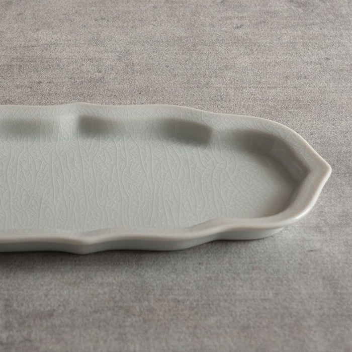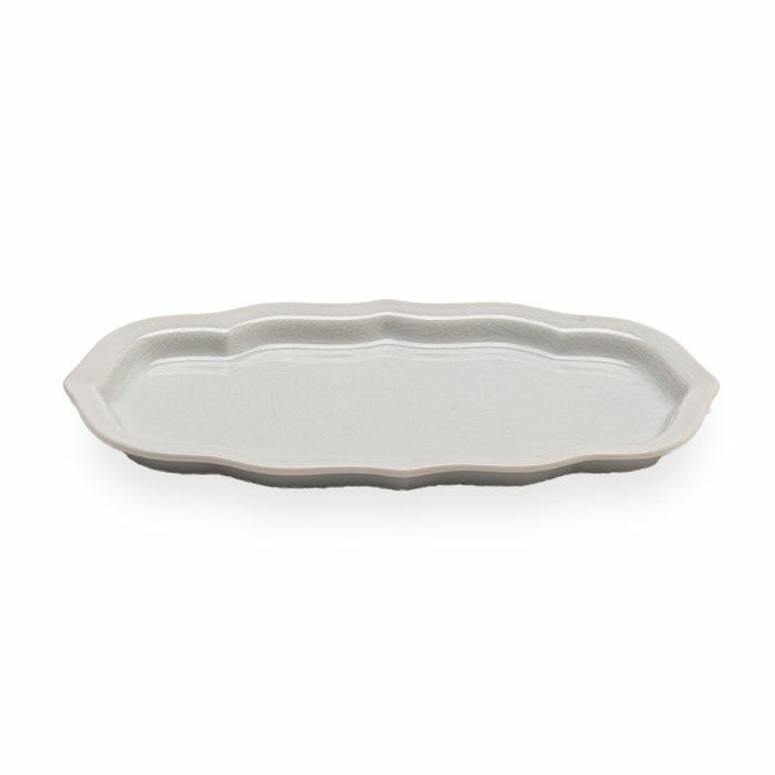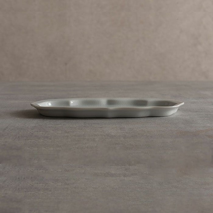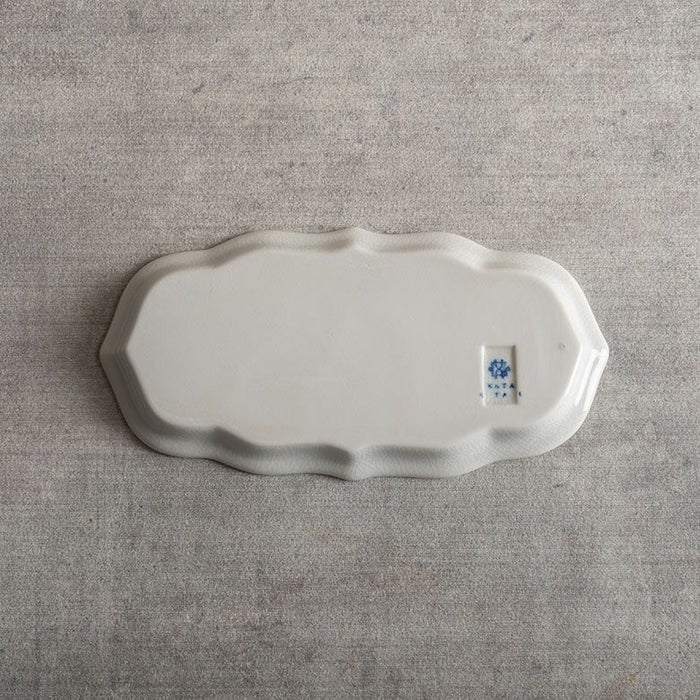 油煙型突出皿(ゆえんがたつきだしざら)は、お料理の一番最初に出す「突き出し」用として使われてきた、伝統的な形のお皿です。横長のフォルムなので、取り皿として使っても良いですし、形を活かして小さなスイーツを2〜3つ並べても可愛らしくまとまります。カタクタニシシリーズの中でも特に個性的で、人気の高い形です。