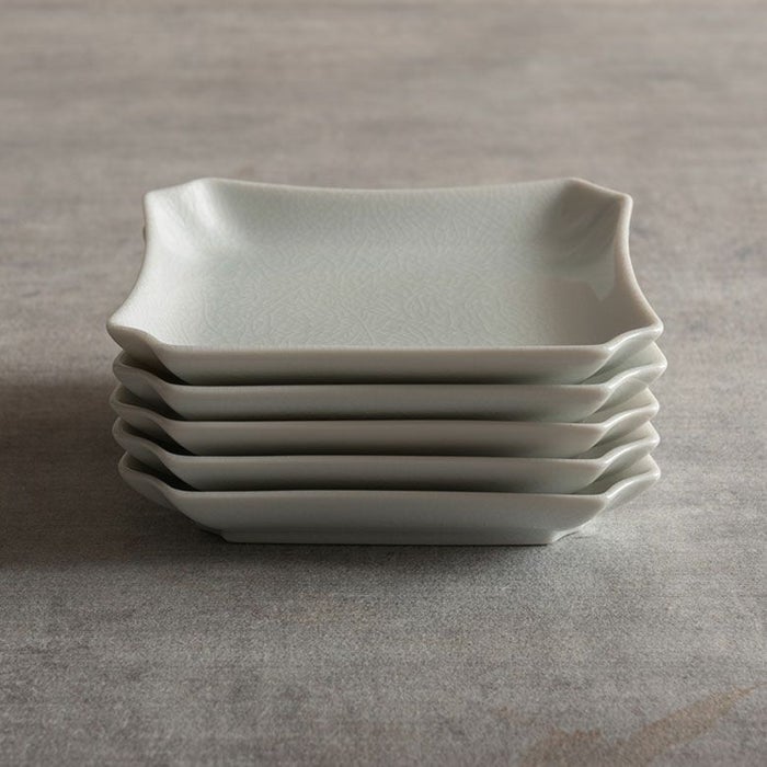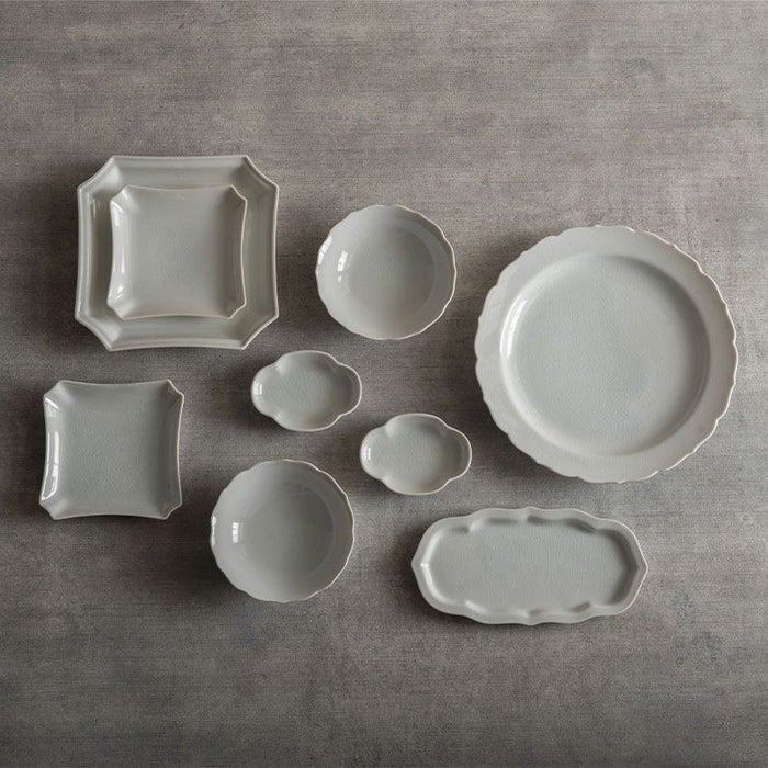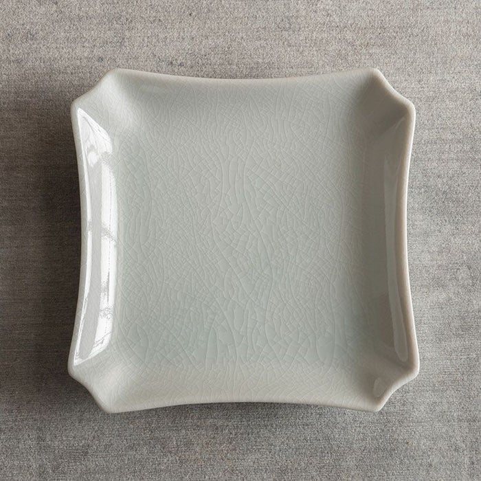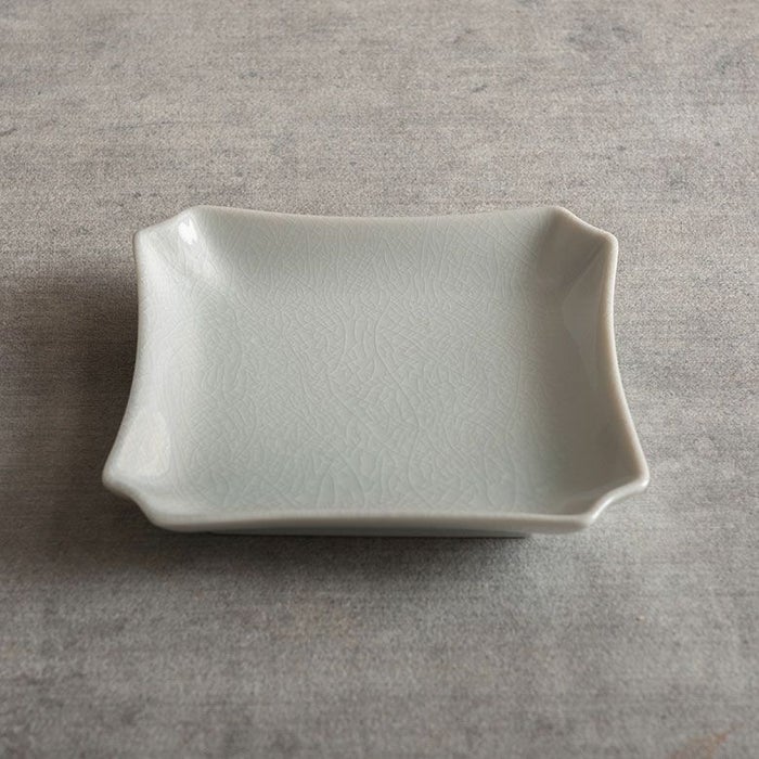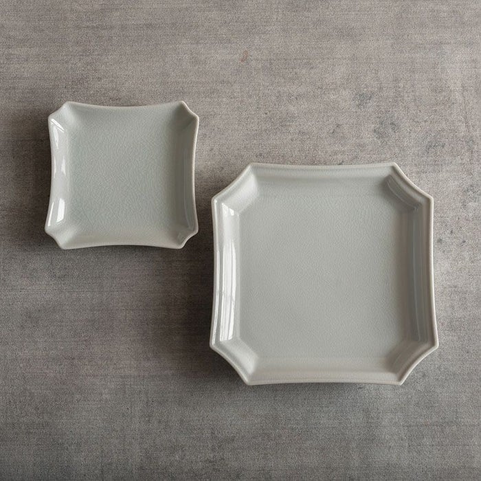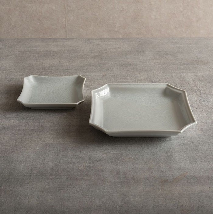 隅切角皿(すみきりかくざら)は、その名の通り、4つの角を切り落としたようなデザインの角皿です。折り紙を折ったようなフォルムが、和の趣とモダンな雰囲気を兼ね備え、食卓を美しく引き立てます。