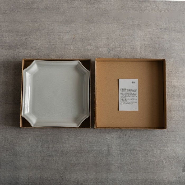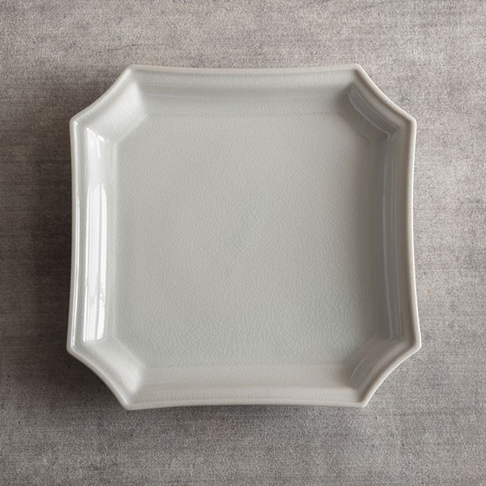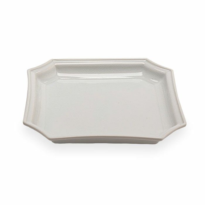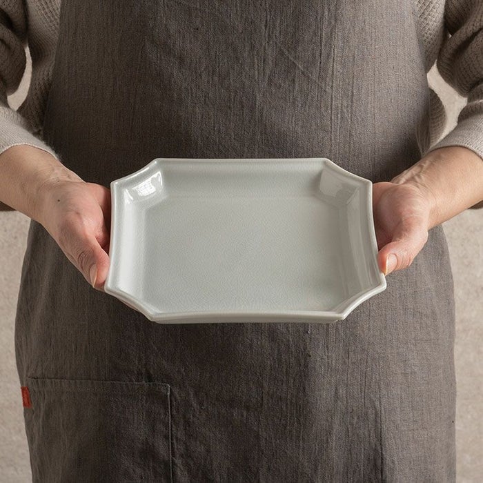 隅切角皿(すみきりかくざら)は、その名の通り、4つの角を切り落としたようなデザインの角皿です。折り紙を折ったようなフォルムが、和の趣とモダンさを兼ね備えた美しい一枚。