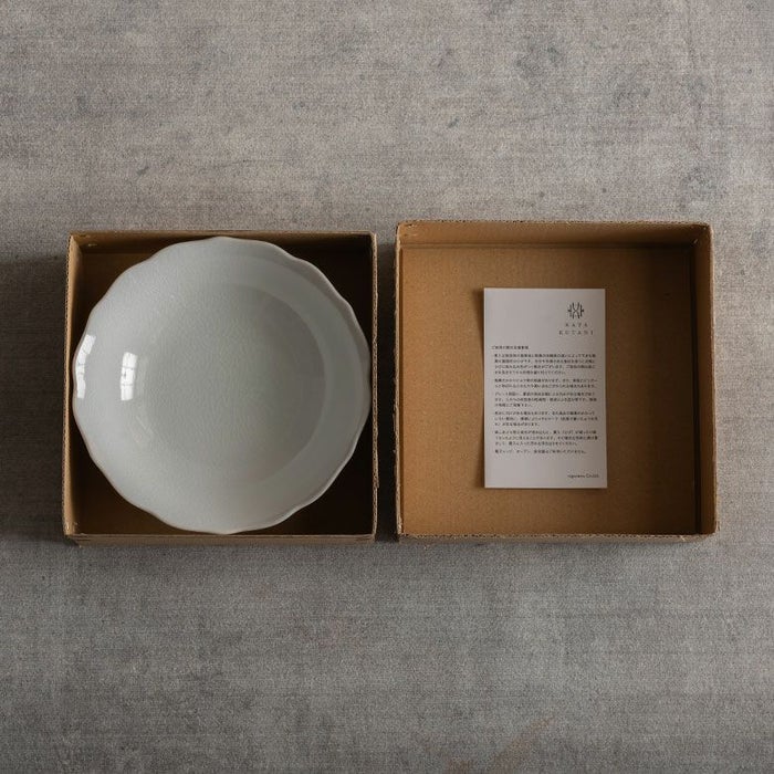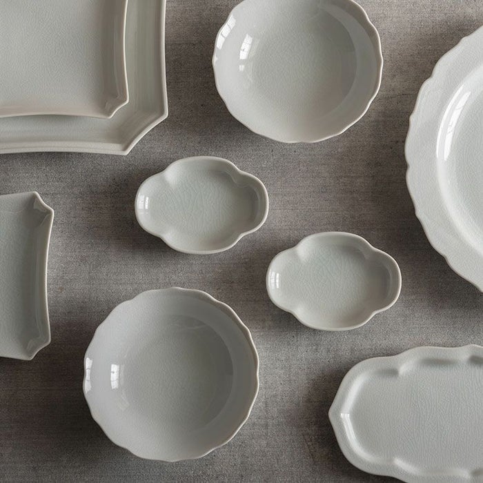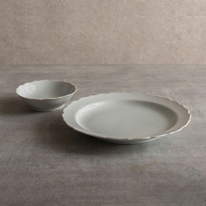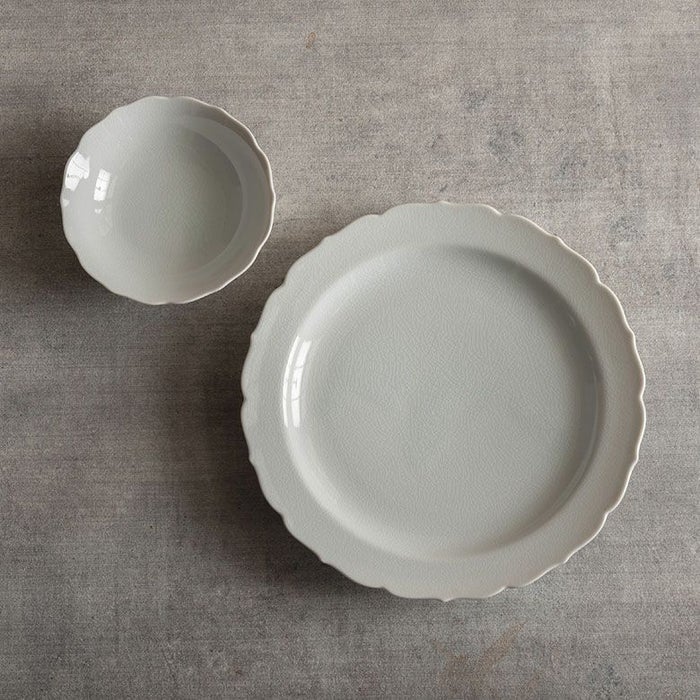 桔梗の少しとがった花びらの先を思わせるスカラップは、かわいくなり過ぎないクールさを併せ持ったデザイン。丸や四角のお皿が多い中で、曲線の美しい縁取りが控えめにお料理を受け止めてくれます。