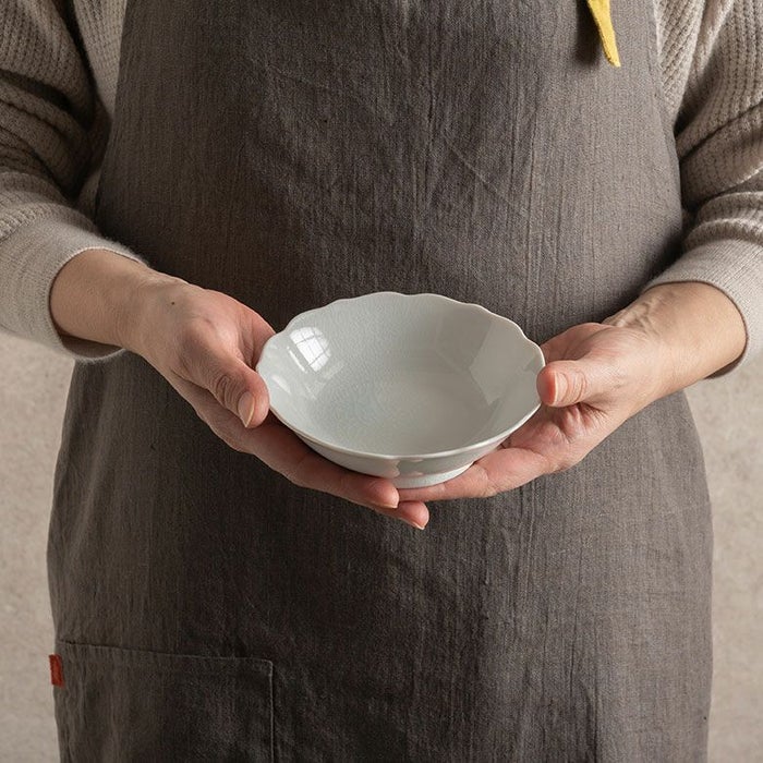 桔梗(ききょう)の花の形をした小鉢サイズの器。お浸しや和え物など、少し深さの欲しいお料理にぴったりです。ヨーグルトやフルーツを盛り付けるのにもちょうどいいサイズ。
