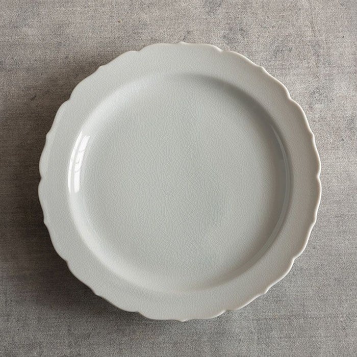 桔梗の少しとがった花びらの先を思わせるスカラップは、かわいくなり過ぎないクールさを併せ持ったデザイン。丸や四角のお皿が多い中で、曲線の美しい縁取りが控えめにお料理を引き立てます。