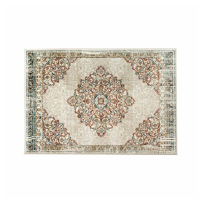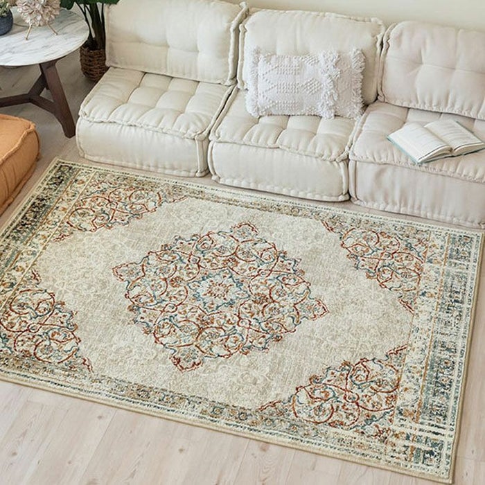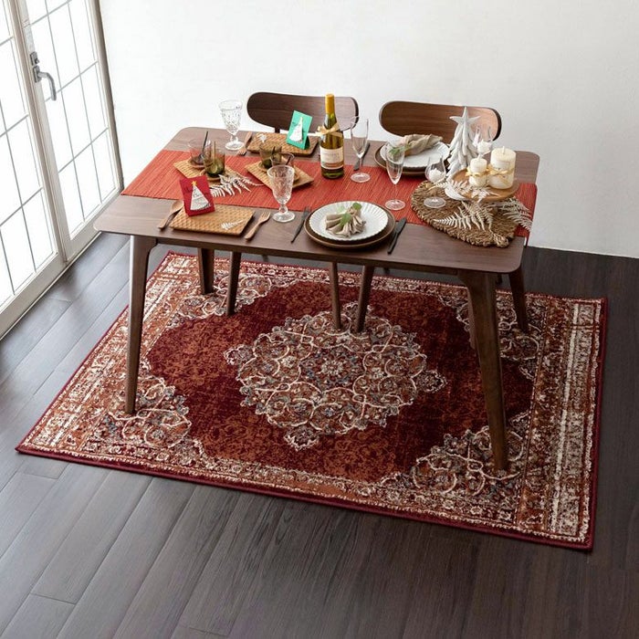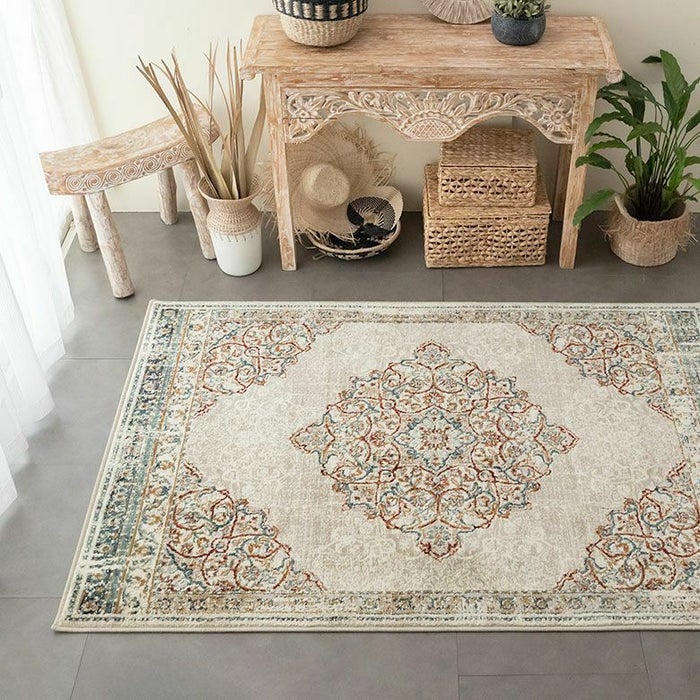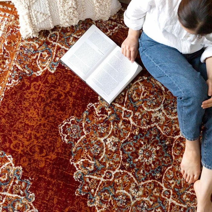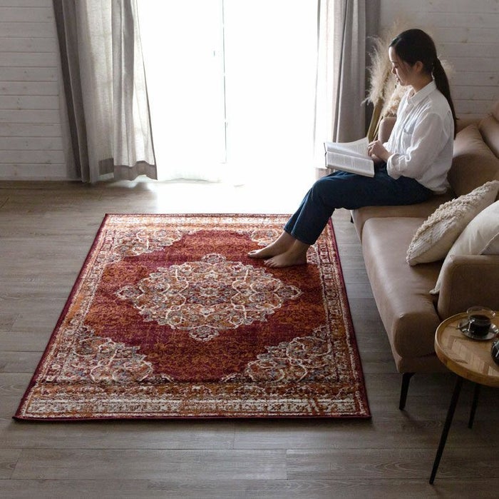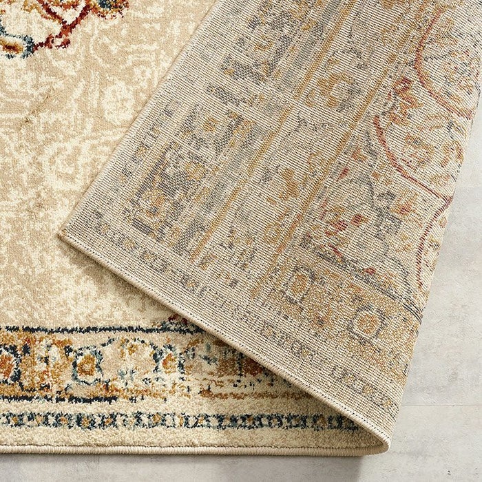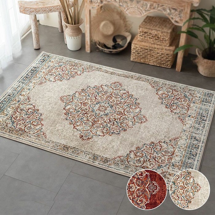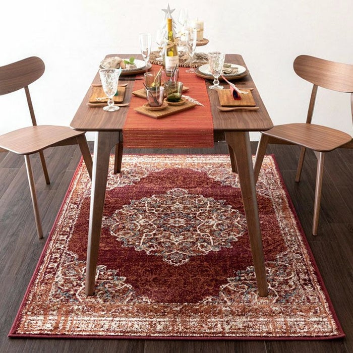 ラグの中心には「メダリオン(記章)」と呼ばれる大きなモチーフがあり、各コーナーにも模様が配置されています。メダリオンは建築やファッションなどさまざまな分野で使われる伝統的なデザイン。ラグ全体に柄があるタイプに比べ、中央に柄が集まることで視線が自然と中心に集まり、お部屋を広く見せる効果が期待できます。