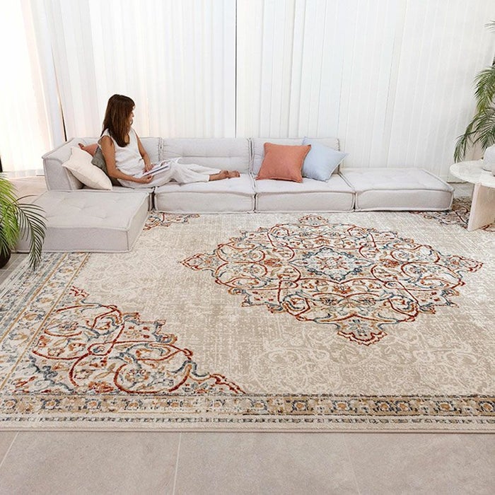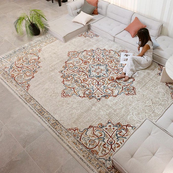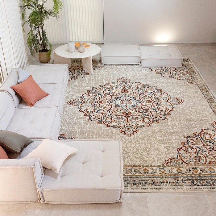 ベースのアイボリーはクリームがかったカラーで落ち着きがあり、お部屋を明るく見せてくれる効果が。濃い色のソファやダークなカラーの家具との合わせが美しくお部屋にメリハリがつきます。ヴィンテージラグのようなシャビーなカラーで入った柄がソファや家具とのつなぎ役となってくれます。