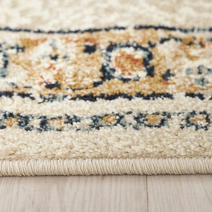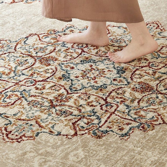 ラグの中心には「メダリオン(記章)」と呼ばれる大きなモチーフがあり、各コーナーにも模様が配置されています。メダリオンは建築やファッションなどさまざまな分野で使われる伝統的なデザイン。ラグ全体に柄があるタイプに比べ、中央に柄が集まることで視線が自然と中心に集まり、お部屋を広く見せる効果が期待できます。