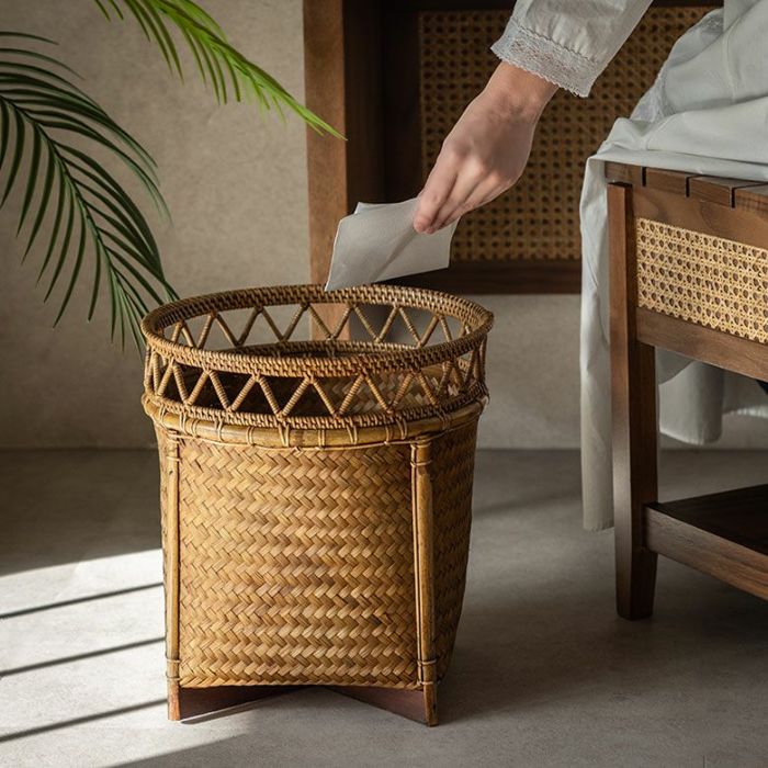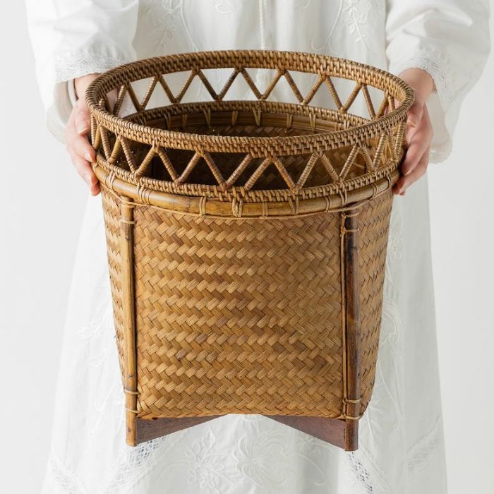東南アジアのリゾートインテリアに合わせたい、ラタンとバンブーでできたバスケット。薄く割いたバンブー(竹)を交互に斜めに編みこんでバスケットを作り、上部にはラタン(籐)でジグザグ模様を施しています。