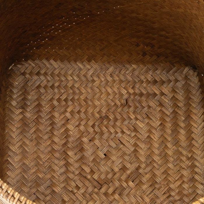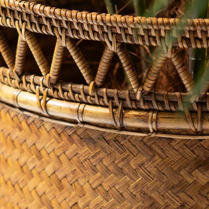 東南アジアのリゾートインテリアに合わせたい、ラタンとバンブーでできたバスケット。薄く割いたバンブー(竹)を交互に斜めに編みこんでバスケットを作り、上部にはラタン(籐)でジグザグ模様を施しています。