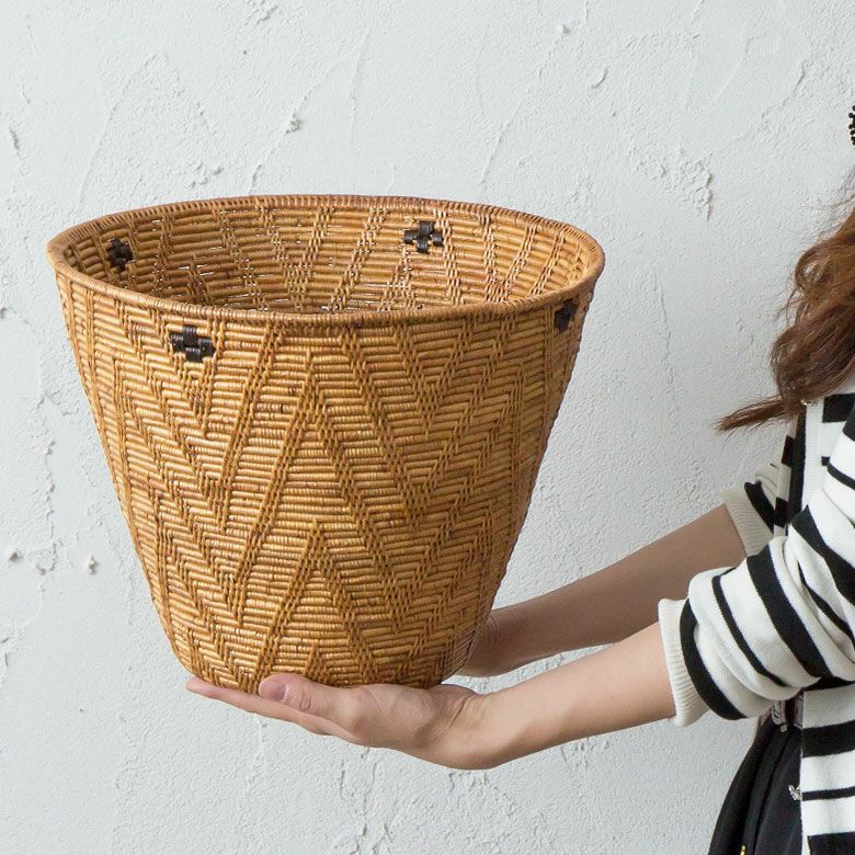 | ご注意 | ※ハンドメイドのためサイズ・形が写真と異なる場合があります。 ※底の中心部分は編み込の工程上、小さな穴が開いています。 ※長期間、衣類などを入れて放置しておくと色移りする場合がございますのでお気を付けください。 ※乾燥によってアタの繊維が収縮すると”ゆがみ”が生じる場合があります。 小さなゆがみであれば逆方向にひねれば解消することができます。強くひねり過ぎると壊れる場合もありますのでご注意ください。 |