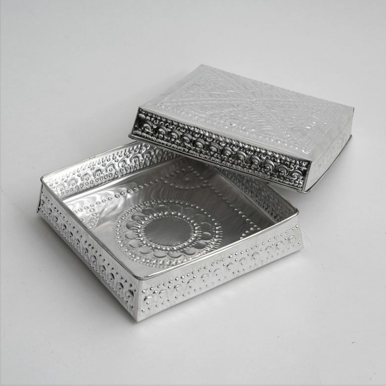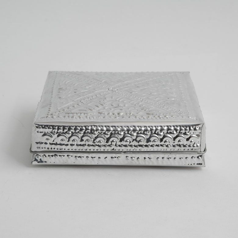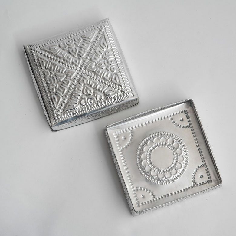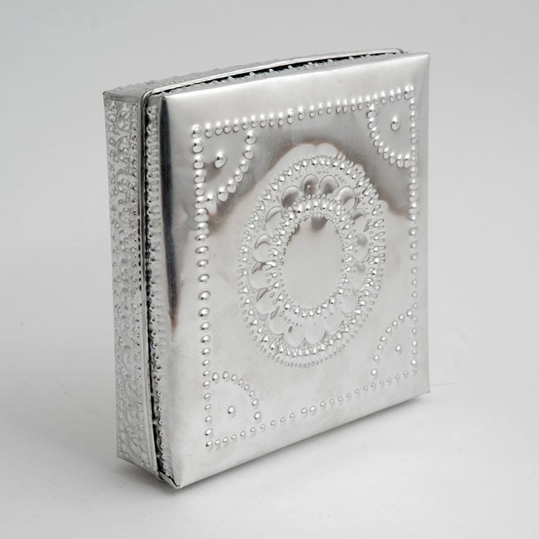細かな模様の装飾が施されたハンドメイドの温もりも感じるアルミ製小物入れ。