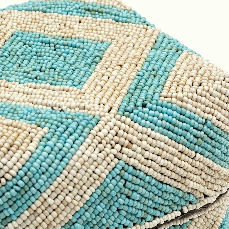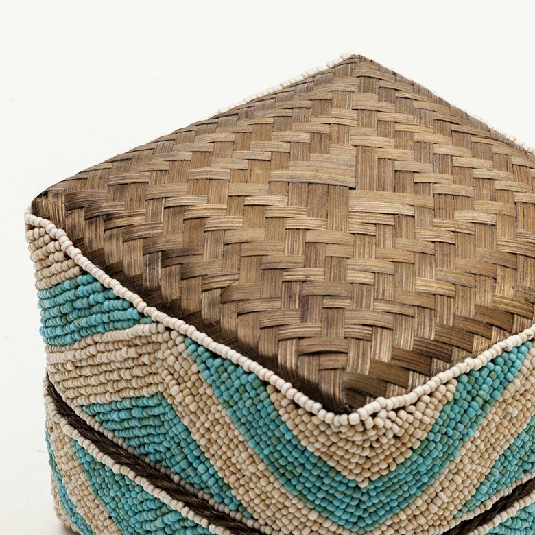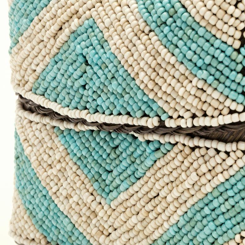 手作業で竹のスライスを編み、贅沢に底以外の全面をビーズでデコレーションした、華やかなアイテムです。