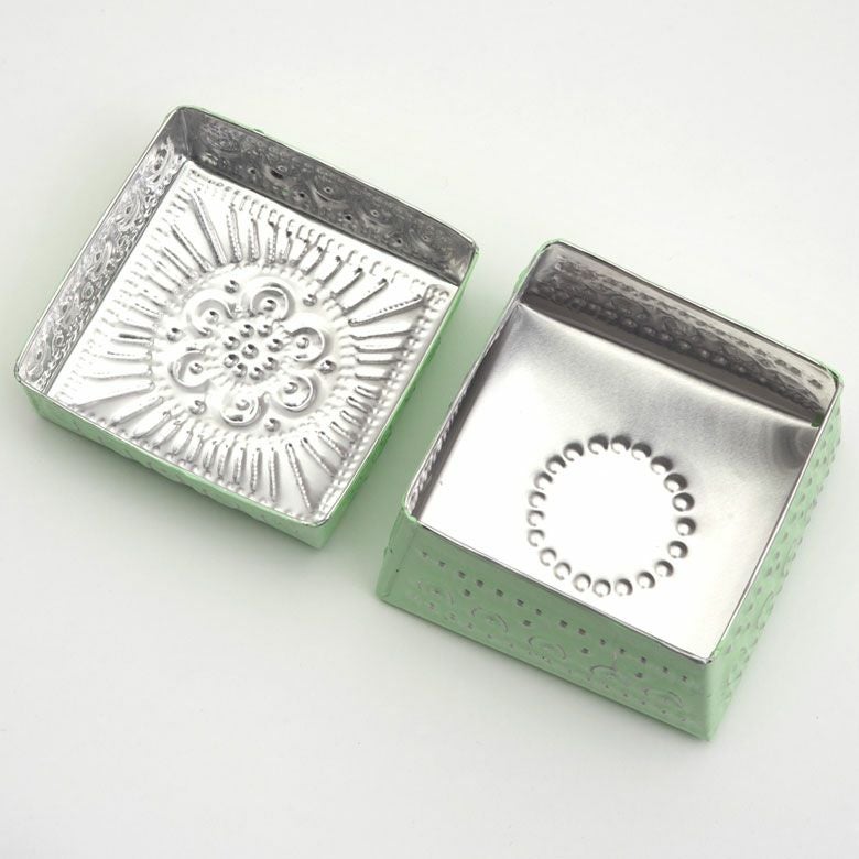 | ご注意 | ※ハンドメイドのためサイズ・形が写真と異なる場合があります。 ※食品試験は受けておりませんので食器としては使用しないでください。 ※液体、水物は入れないで下さい。 ※アルミは柔らかな素材ですので凹みなどが生じた場合は、手で形を整えて直してください。 ※アルミの凹凸や切り口部分などでケガをしないよう、取り扱いにお気をつけ下さい。 |