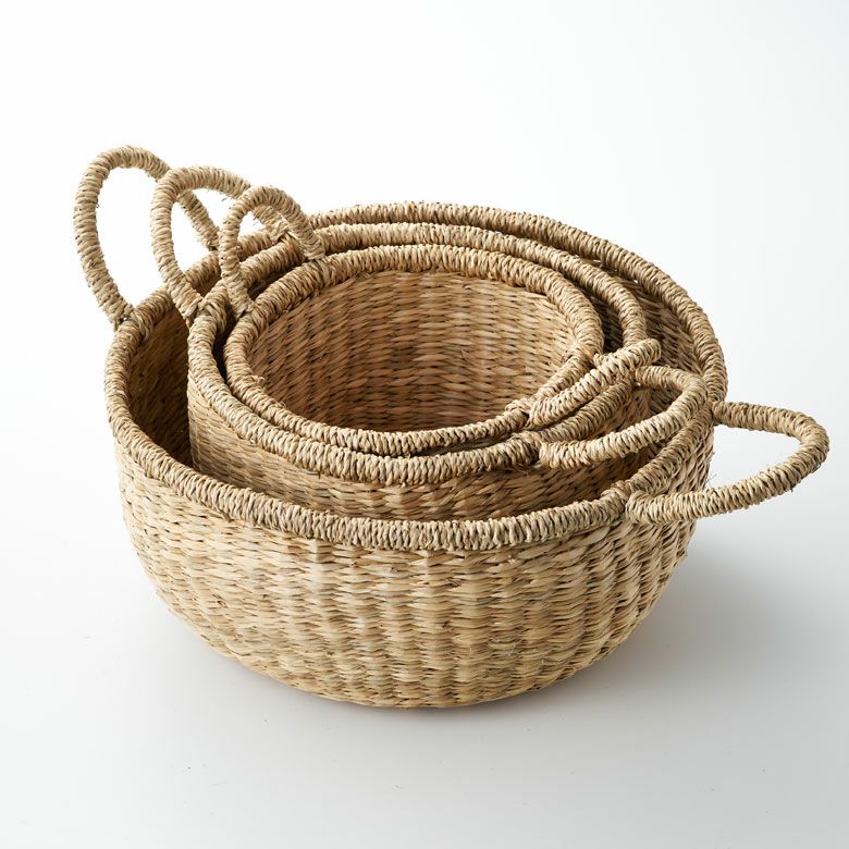 コロンと可愛らしいこちらは、シーグラス(天然水草)をハンドメイドで丁寧に編みこんだぬくもりある天然素材の自然派バスケットです。 どんな場面でも活躍してくれるS/M/L3サイズのセットで、シーンにより使い分けたり複数使いも楽しんでいただけます。 お片付けしたいところや、ちょっと空いたスペースに置いていてもインテリアの邪魔をしません。