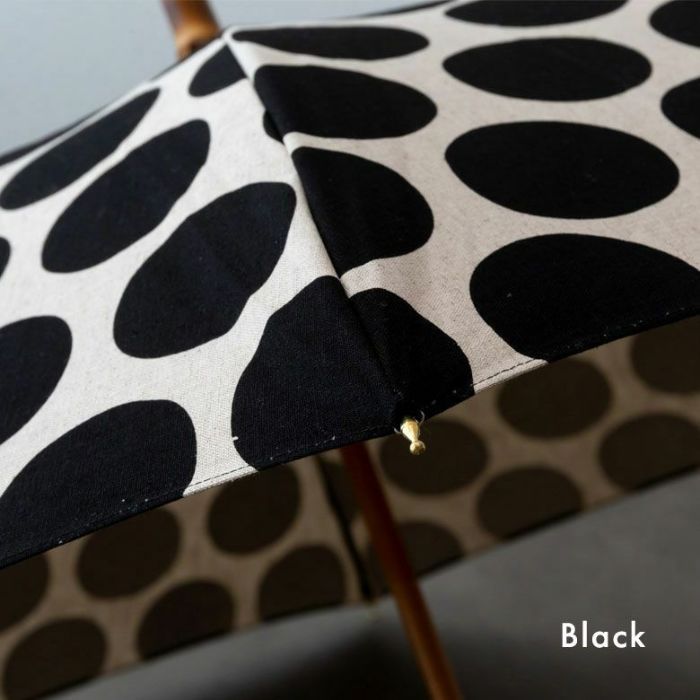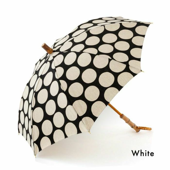 綿麻の混合生地に、大きな水玉が描かれた日傘。上質で飽きのこないシンプルなデザインは、どんなファッションにもよく合います。