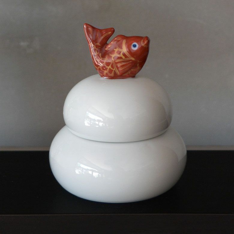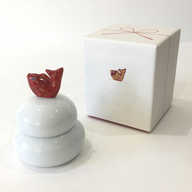 真っ赤な鯛が目を惹く伊万里焼の鏡餅。鏡餅と言えば“だいだい”ですが、こちらの鯛も負けていません! めでタイ!という言葉がピッタリの生きのいい鯛が元気に跳ねています。 定番のだいだいの鏡餅に比べ、鯛のモチーフがちょっとモダンな雰囲気で飾れるので洋室や洋食器とも相性◎ 磁器の艶やかさが目を惹く伊万里焼の鏡餅。手のひらサイズで玄関やダイニング、 リビングと場所を選ばず飾って頂けるとてもかわいい鏡餅飾りです。 磁器なのでワンシーズンだけでなく毎年お正月に使って頂けるのがこの鏡餅の魅力。