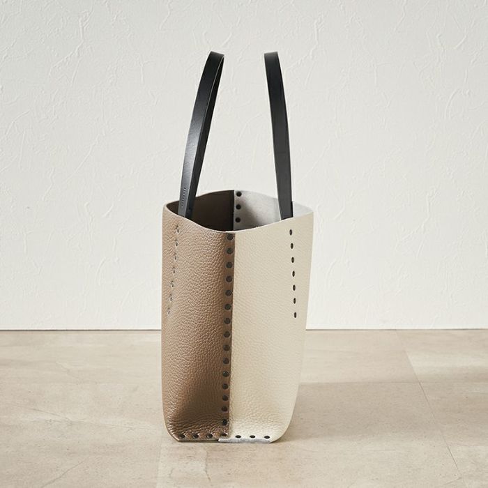 ユニセックスでありながらどこかエレガントで品のあるこちらのバッグは、Payungで一番人気のあるツートーンカラーでご用意致しました。グレーとベージュを掛け合わせたようないいとこどりのエトープ×白いチョークのようなカラーのクレ、そこに2色を引き締めるマットブラックのリベットで仕上げています。
