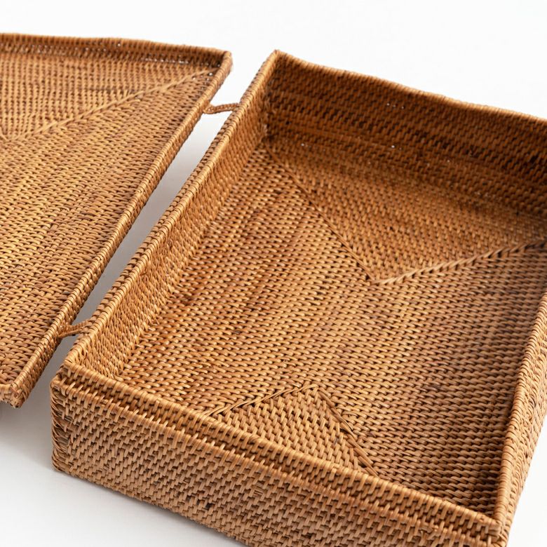 こちらはアタという素材で編まれています。 アタはインドネシアに自生するシダ科の植物です。 そのアタを乾燥させ、茎の部分を丁寧に裂いて編み込んでいき、約一週間天日干しして乾燥させ、その後ココナッツチップなどで1〜3日間燻します。 燻すことにより型崩れしない、そして虫にも強いアメ色の丈夫なアタ製品となります。