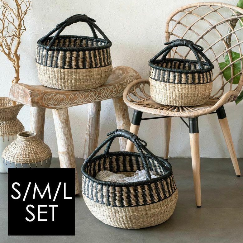 シーグラスのラウンドかごバスケット [ ストライプ SML3個セット ]