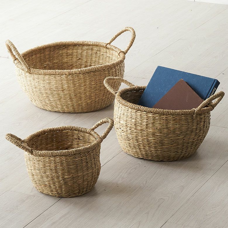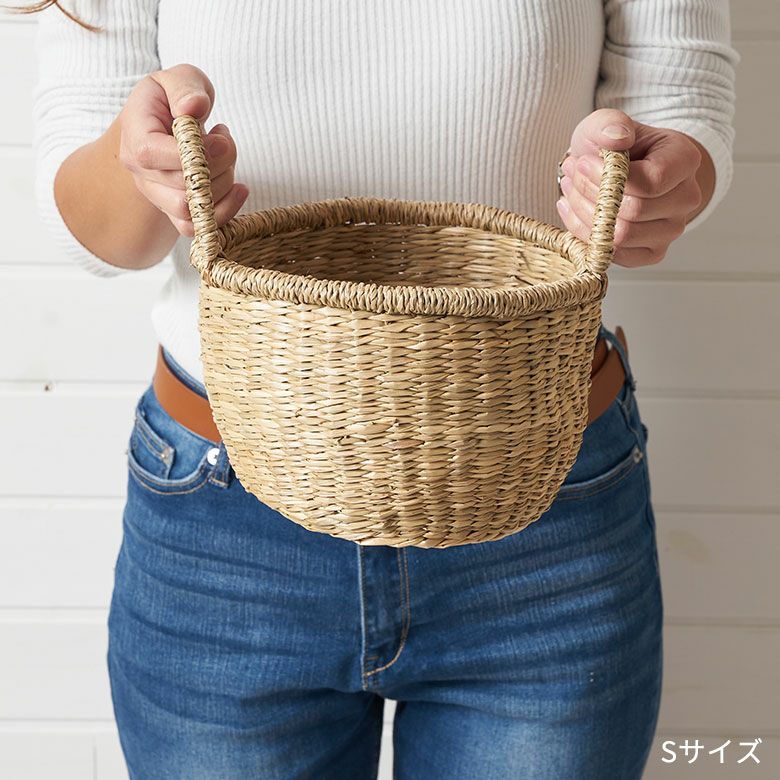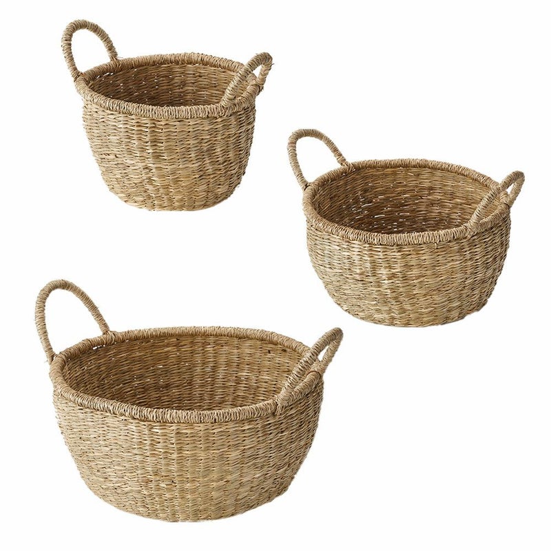 コロンと可愛らしいこちらは、シーグラス(天然水草)をハンドメイドで丁寧に編みこんだぬくもりある天然素材の自然派バスケットです。 どんな場面でも活躍してくれるS/M/L3サイズのセットで、シーンにより使い分けたり複数使いも楽しんでいただけます。 お片付けしたいところや、ちょっと空いたスペースに置いていてもインテリアの邪魔をしません。