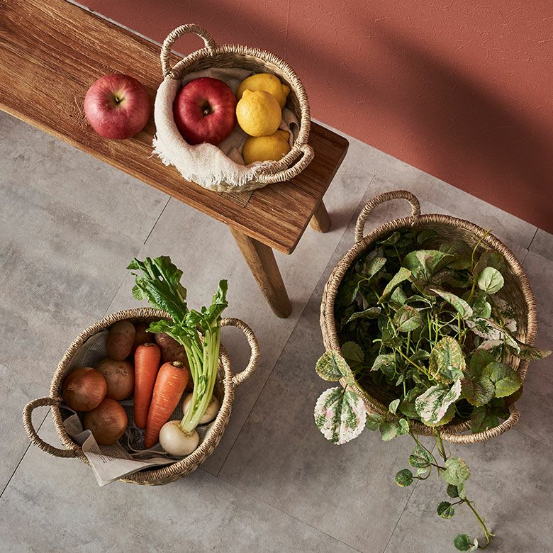 天然素材の風合いを生かしたハンドメイド製品のため、形や編み目に個体差がございます。 ハンドメイドならではの味としてお楽しみいただけると嬉しいです。 散らかる小物もさっと収納でき、とっても便利で可愛らしいバスケットのセットは、是非おすすめしたいアイテムです。