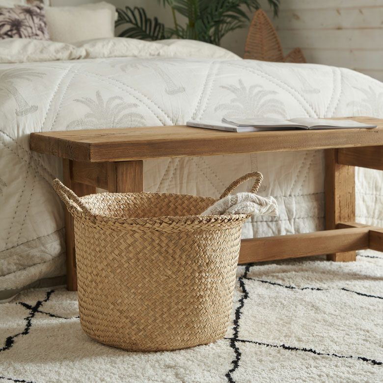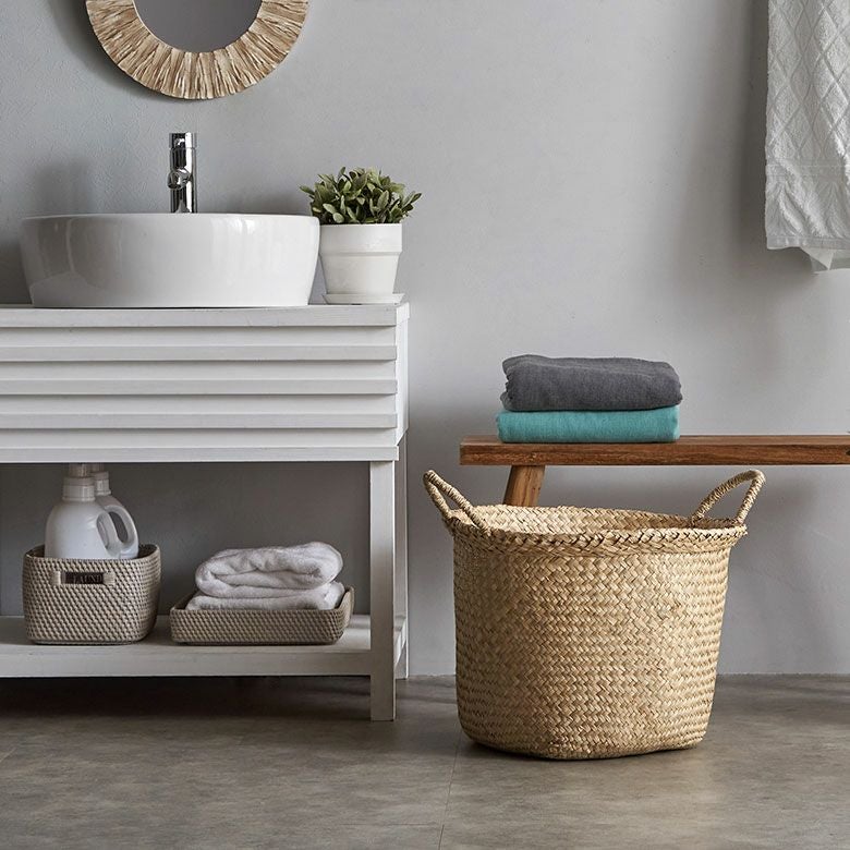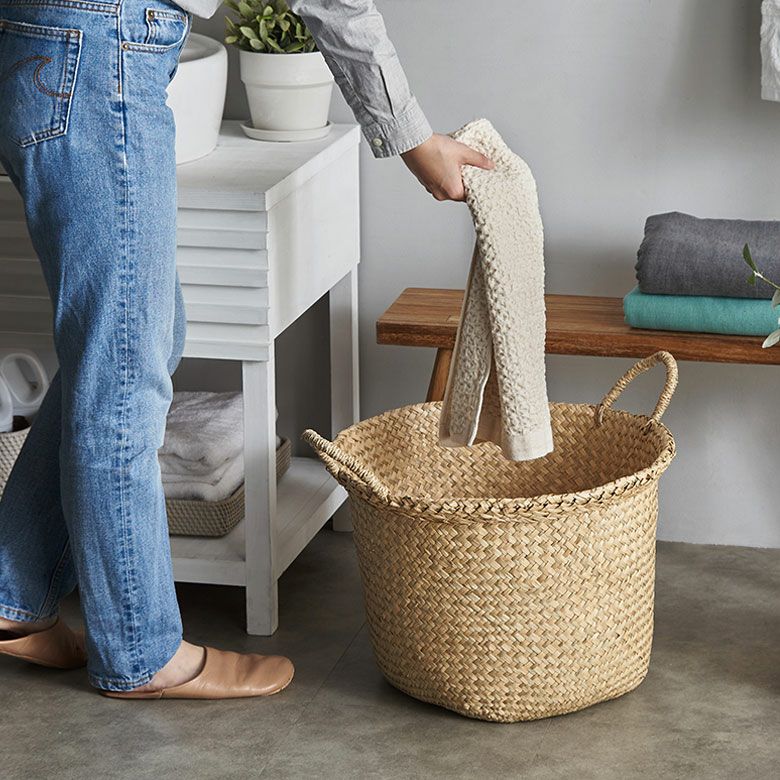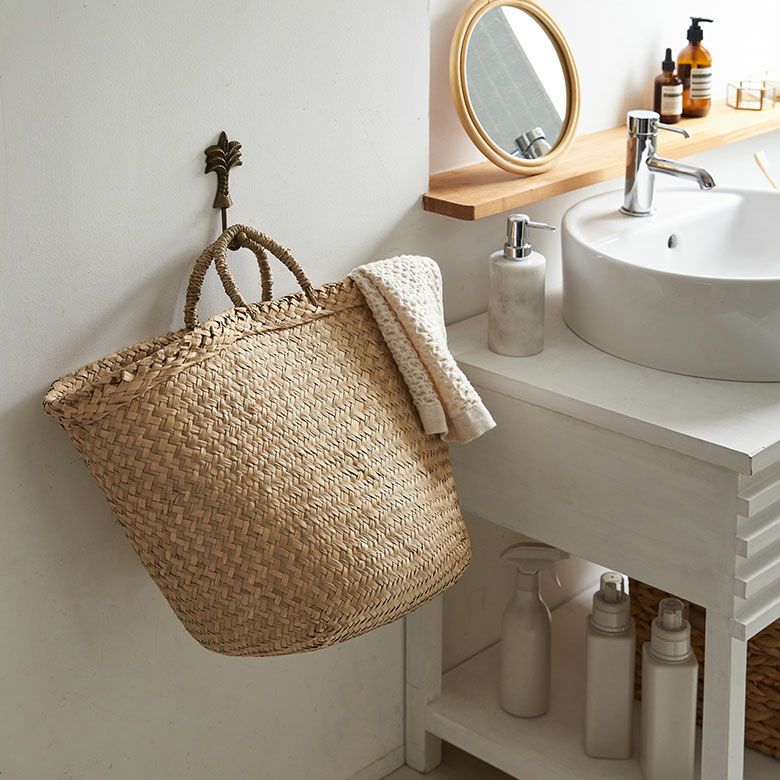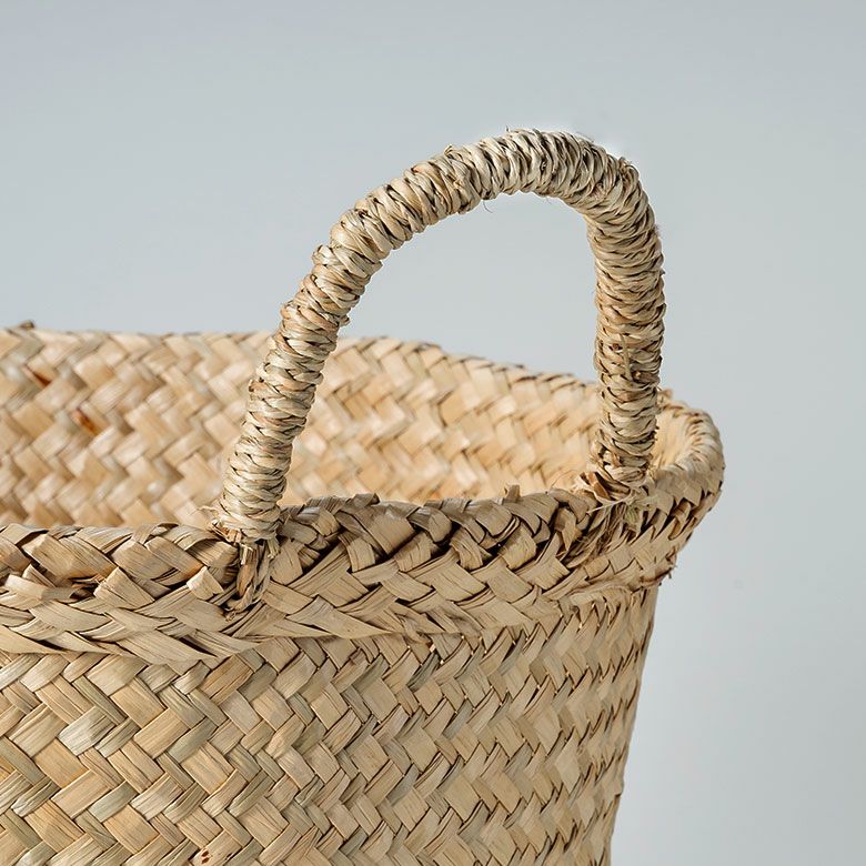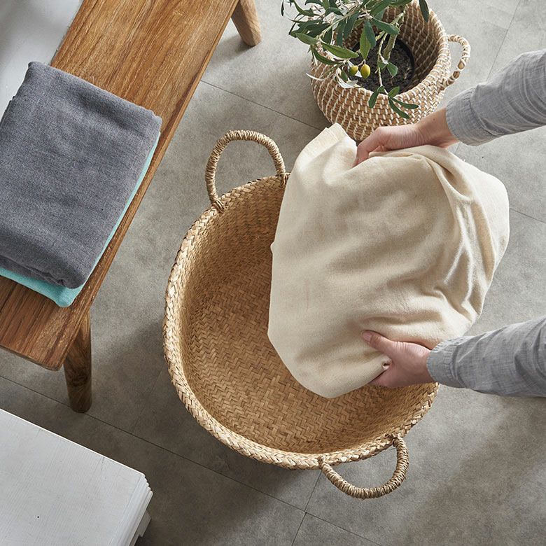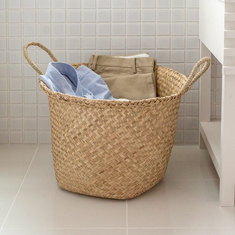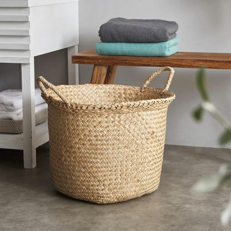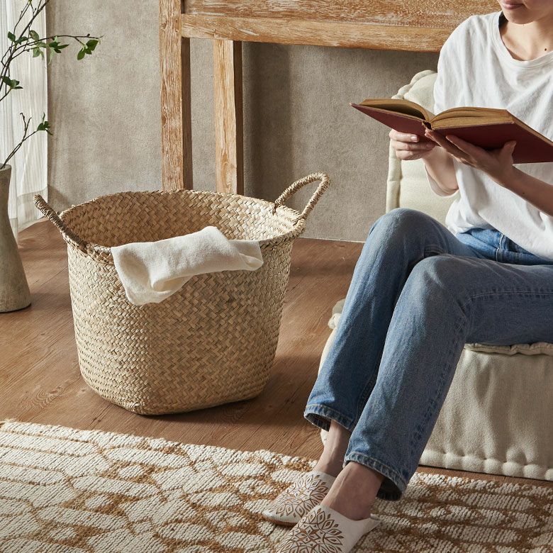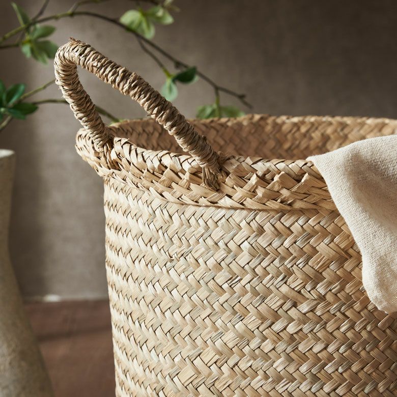 柔らかくしなやかな、天然素材のナチュラルバスケット。たっぷり入る大容量で、リビングやバスルームなどいろんなシーンで使えてマルチに活躍してくれること間違いナシの優れものです。