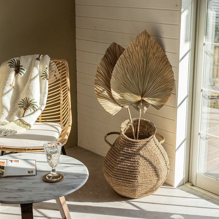 壺のようなデザインのシーグラスバスケット。ざっくりと編まれていて空気をたくさん含んだ手編みのセーターのような素朴さを感じさせ、置く場所に奥行きを与えます。