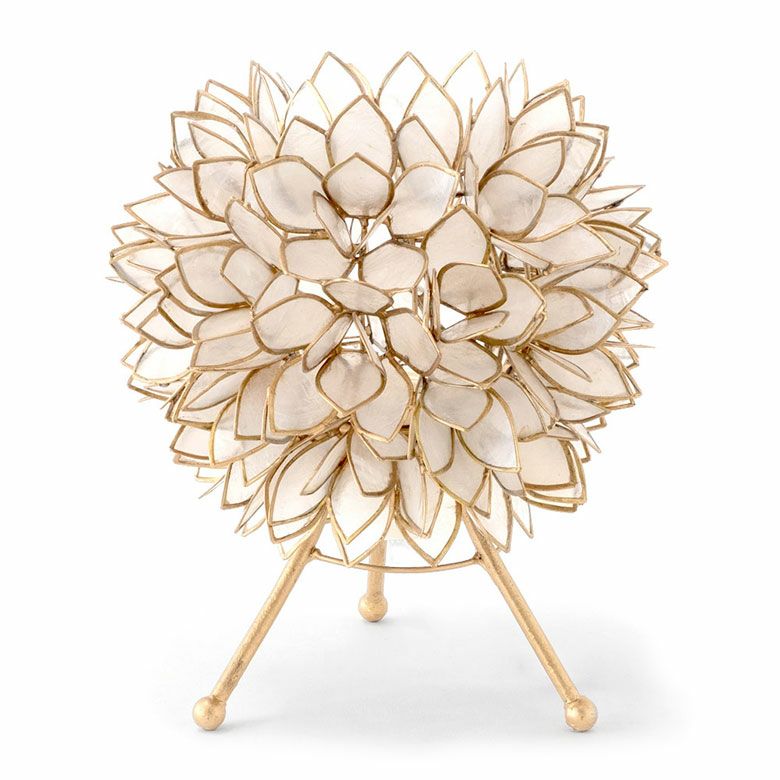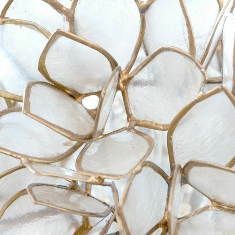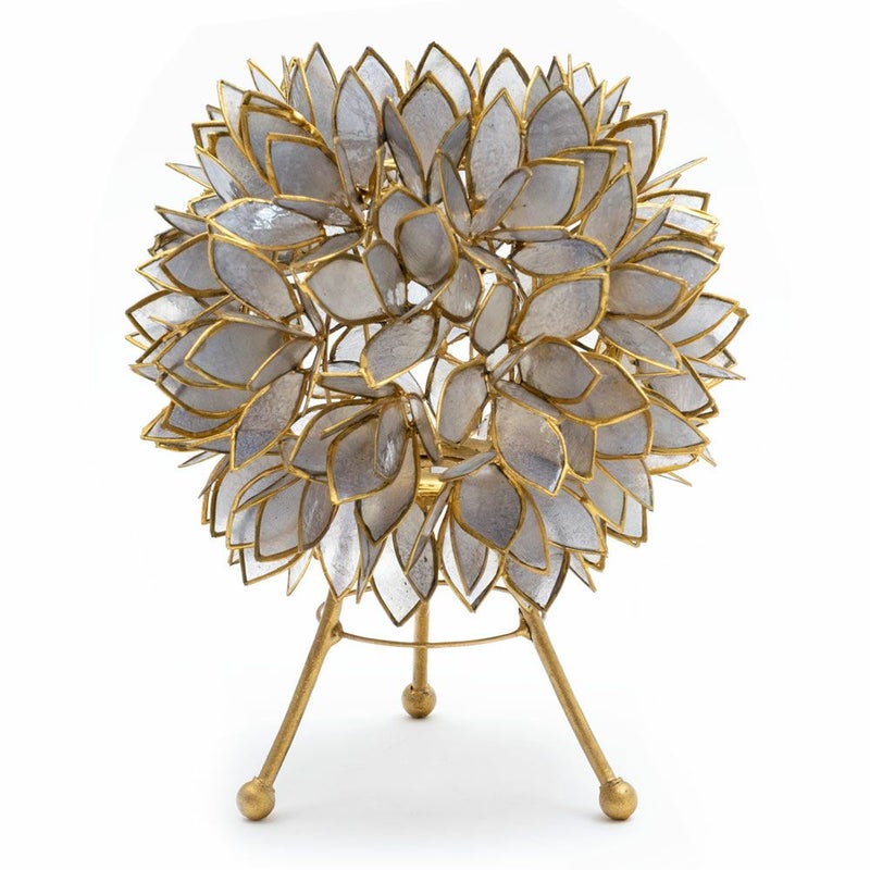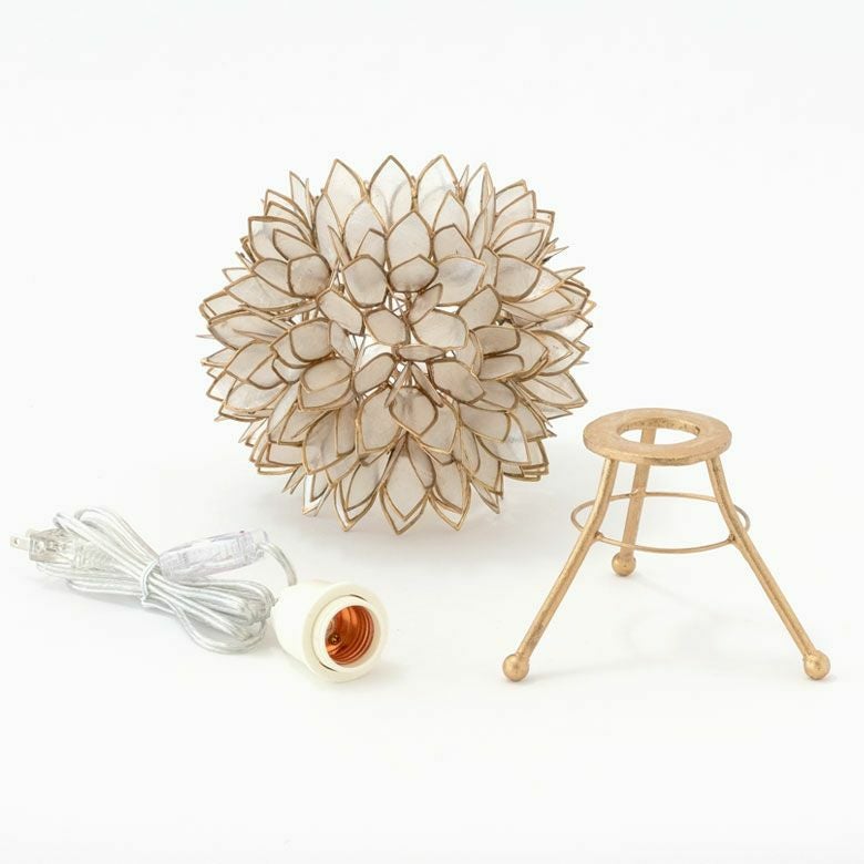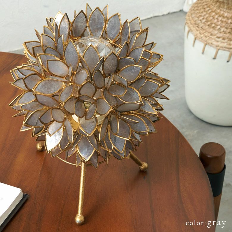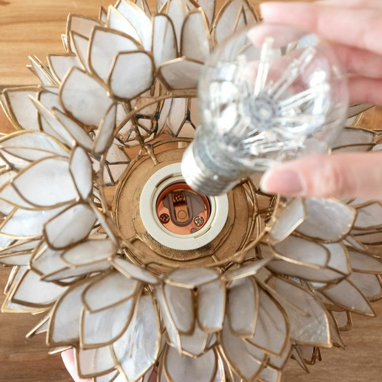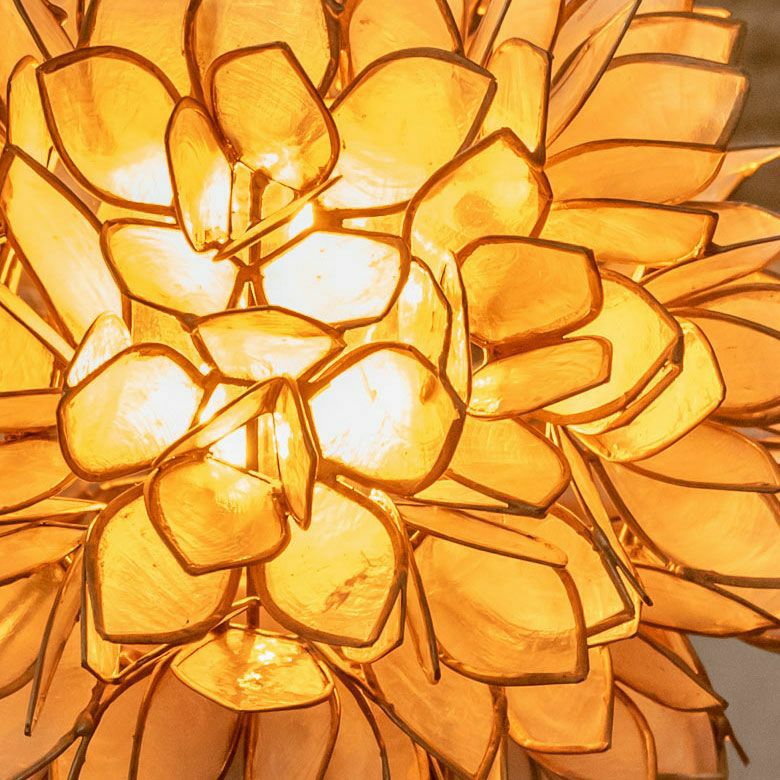 置いておくだけでも、まるでそこにお花が咲いているかのようなデザイン。こちらは、天然のカピス貝を贅沢に使った、アジアン・スタンドランプです。透けるほど薄く削られたシェルはとても繊細で上品。シェルの一枚一枚が違った表情で、手作りならではの温かみを感じます。