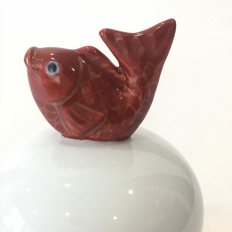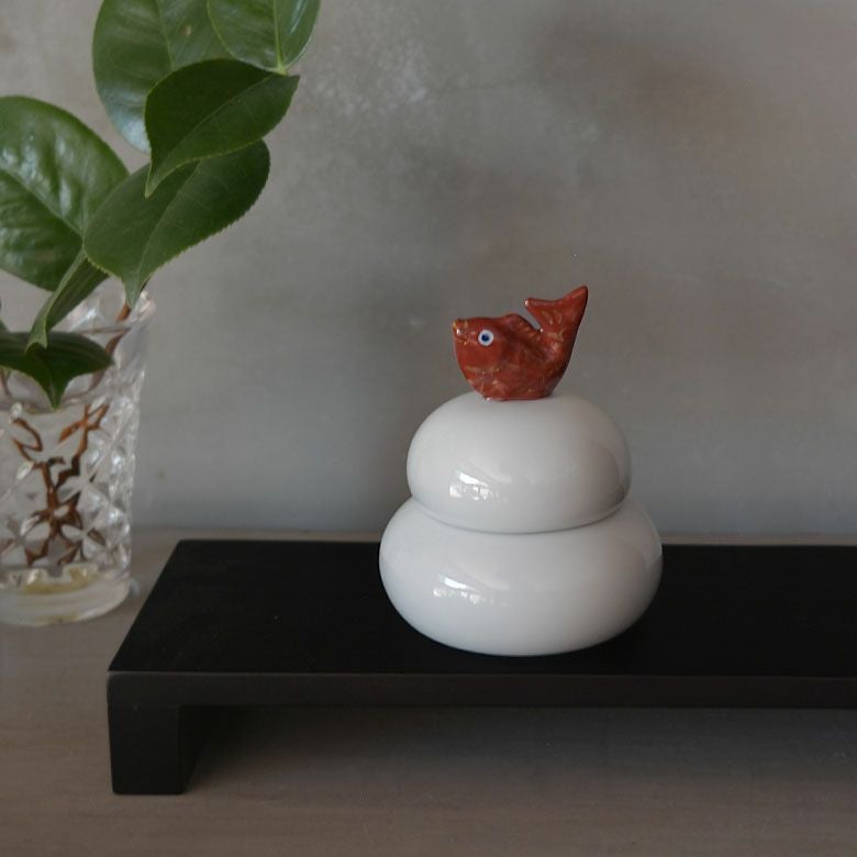 真っ赤な鯛が目を惹く伊万里焼の鏡餅。鏡餅と言えば“だいだい”ですが、こちらの鯛も負けていません! めでタイ!という言葉がピッタリの生きのいい鯛が元気に跳ねています。 定番のだいだいの鏡餅に比べ、鯛のモチーフがちょっとモダンな雰囲気で飾れるので洋室や洋食器とも相性◎ 磁器の艶やかさが目を惹く伊万里焼の鏡餅。手のひらサイズで玄関やダイニング、 リビングと場所を選ばず飾って頂けるとてもかわいい鏡餅飾りです。 磁器なのでワンシーズンだけでなく毎年お正月に使って頂けるのがこの鏡餅の魅力。