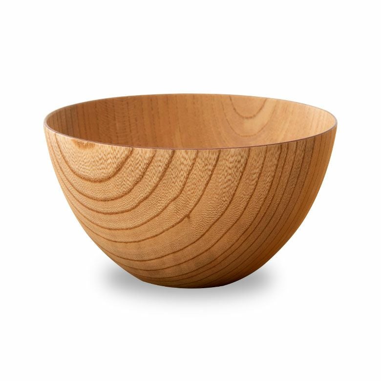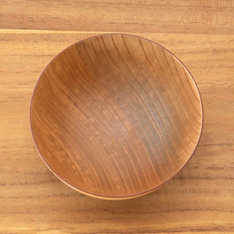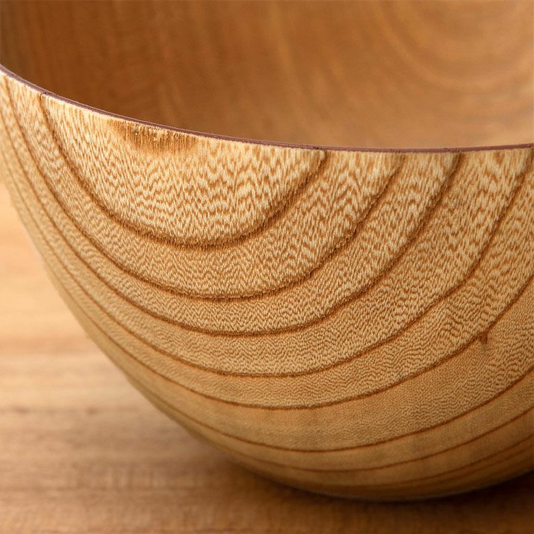 縁の辺りは薄くなっていますが天然木の欅で作っていますので熱々のスープや丼ものなどを入れても熱さを感じにくい器です。