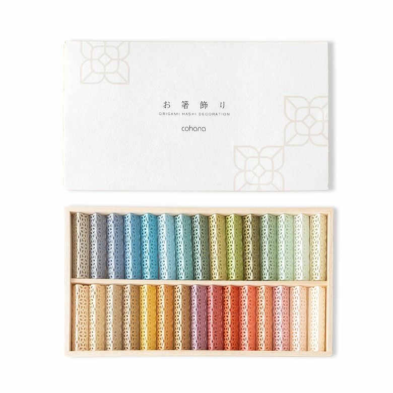 木箱を開けると色とりどりのお箸飾り。きれいに並んだお菓子みたい!使うのがもったいない…と思ってしまうのでしばらく目で見て楽しみたいです。