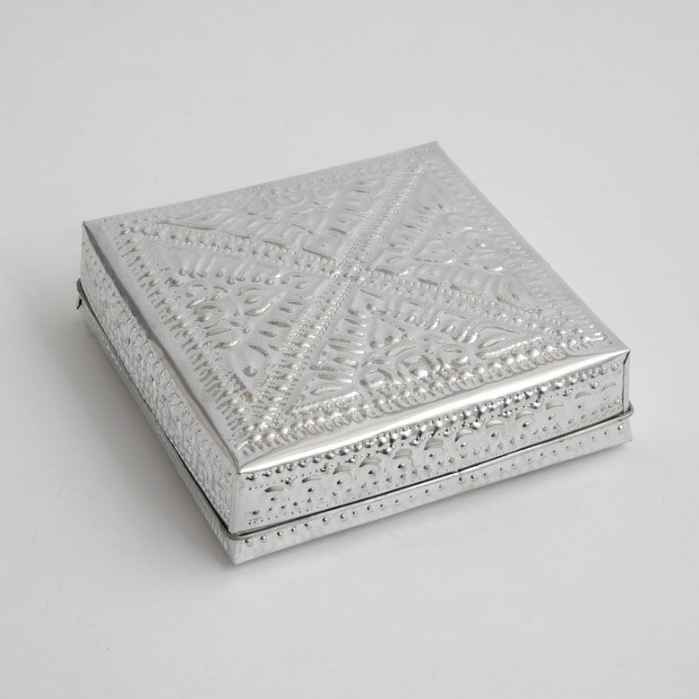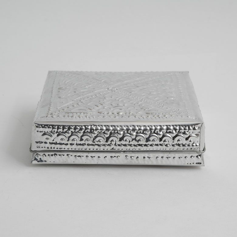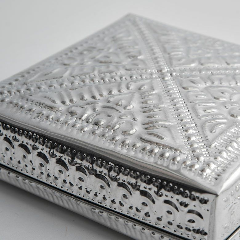 細かな模様の装飾が施されたハンドメイドの温もりも感じるアルミ製小物入れ。