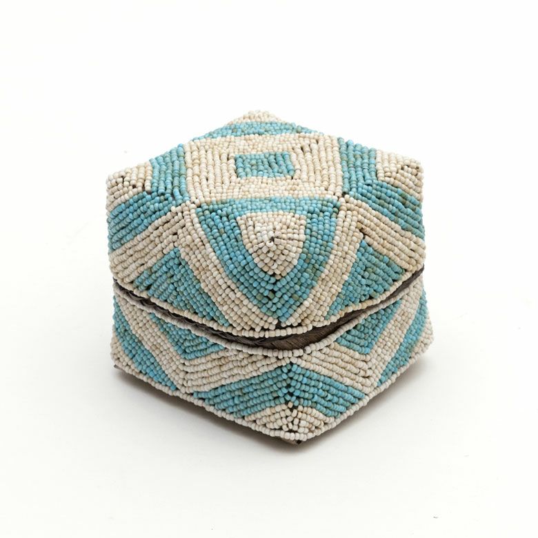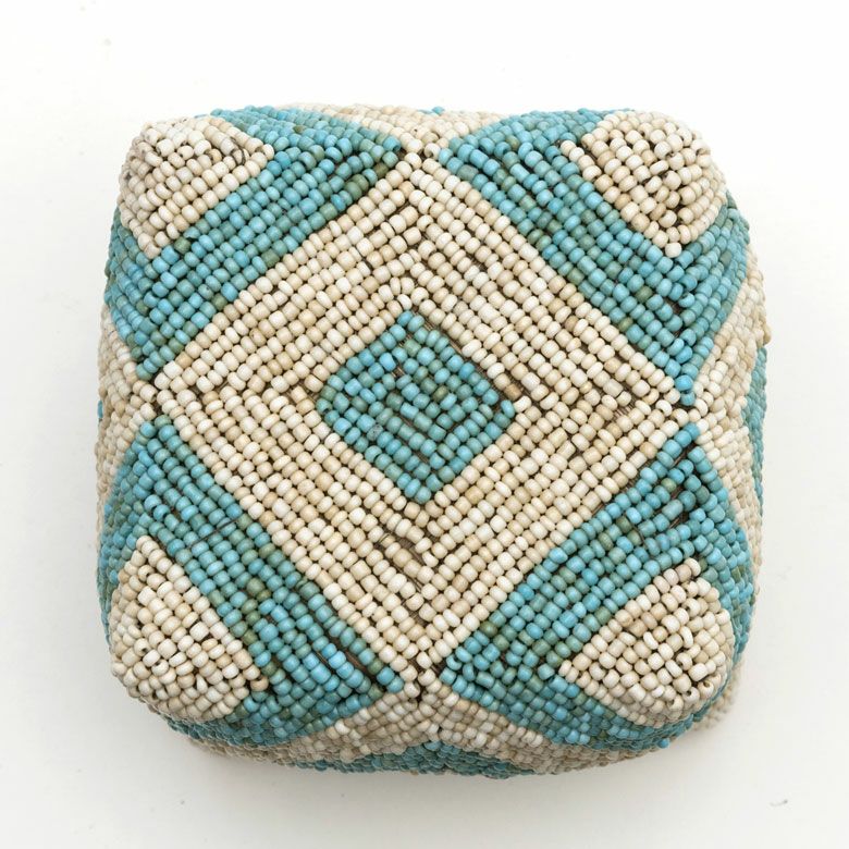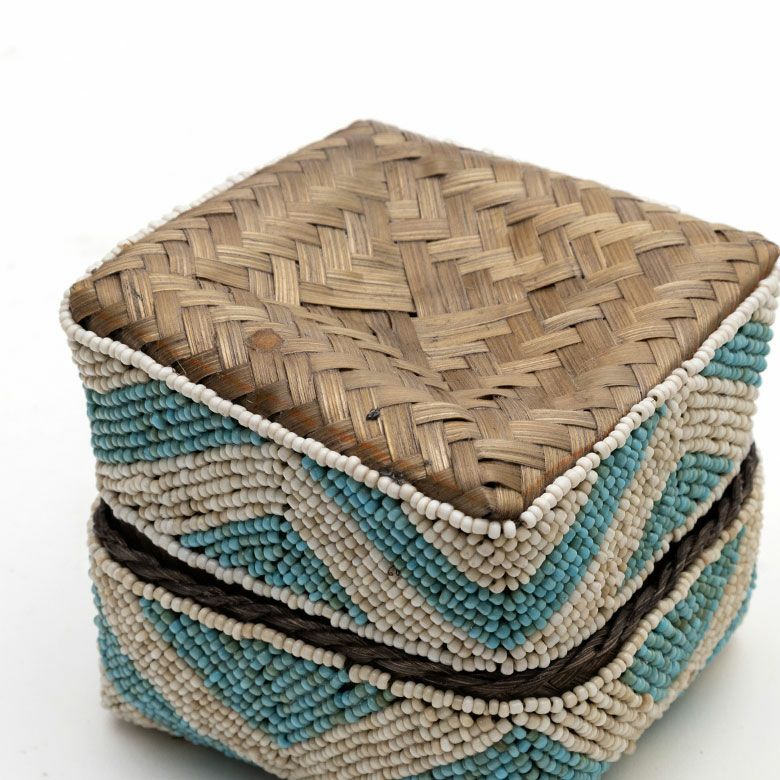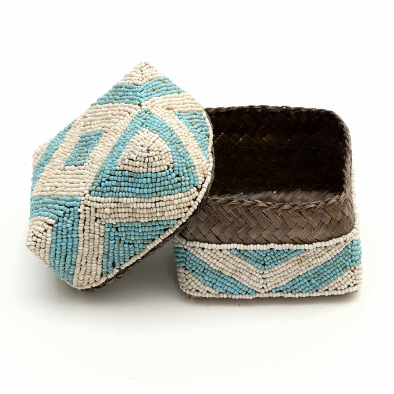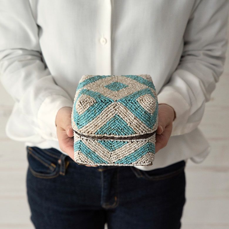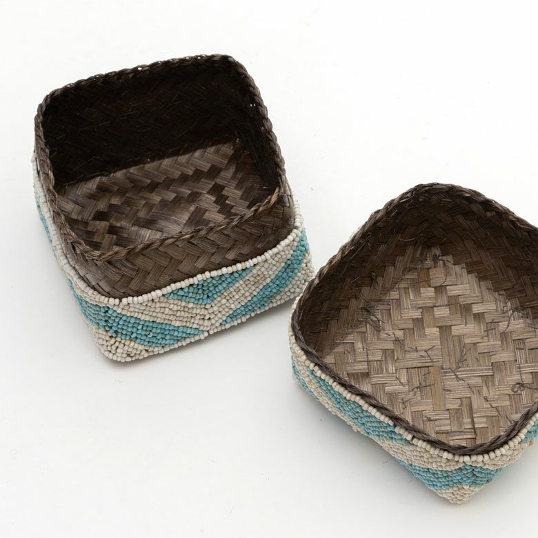 手作業で竹のスライスを編み、贅沢に底以外の全面をビーズでデコレーションした、華やかなアイテムです。