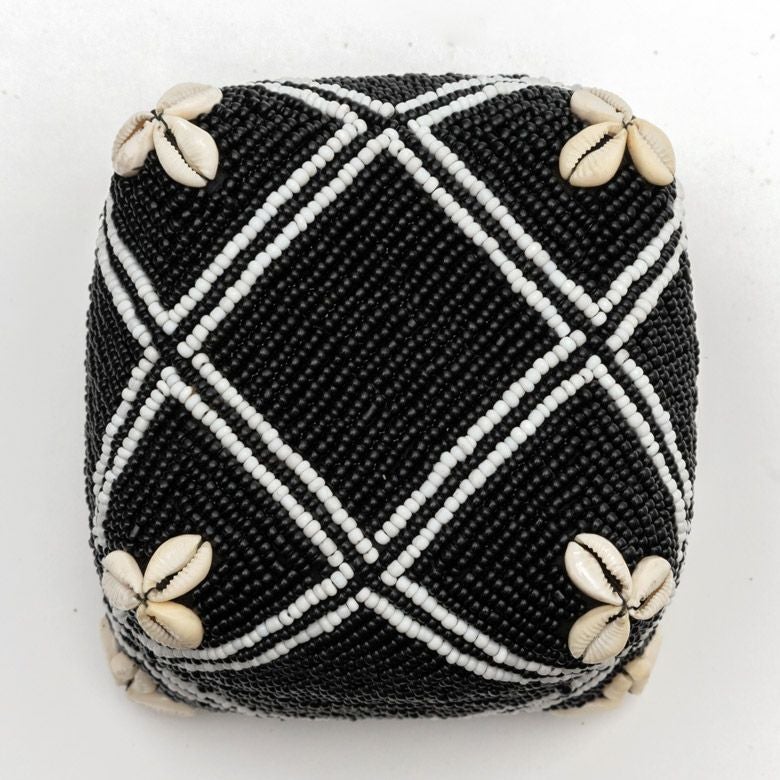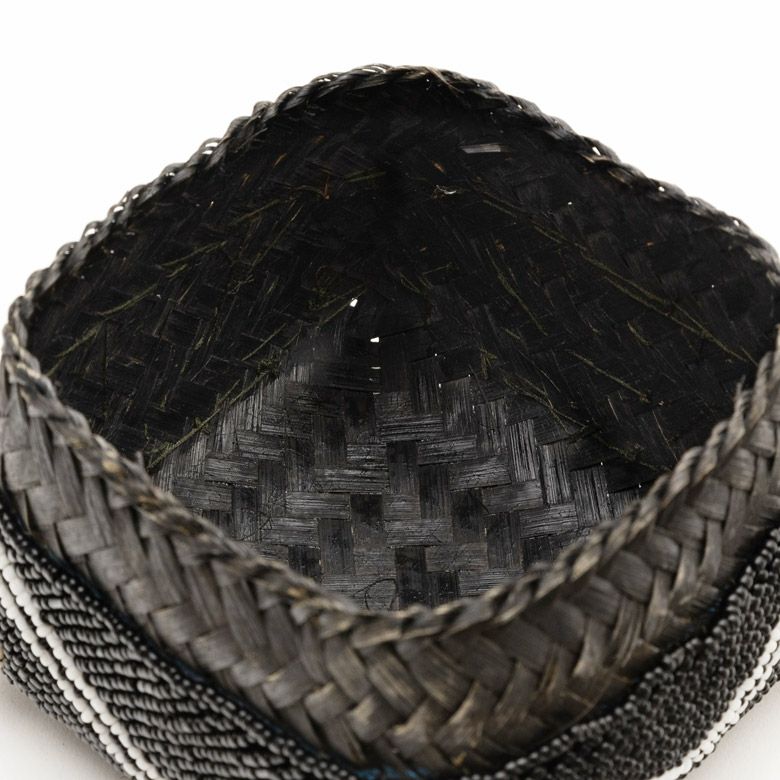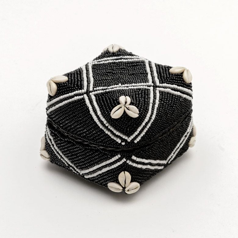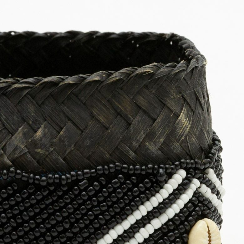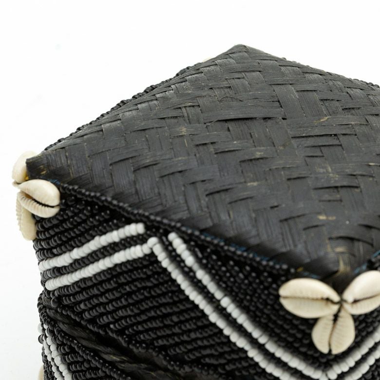 手作業で竹のスライスを編み、贅沢に底以外の全面をビーズでデコレーションした、華やかなアイテムです。