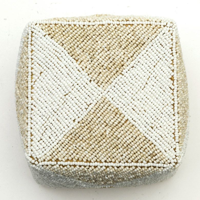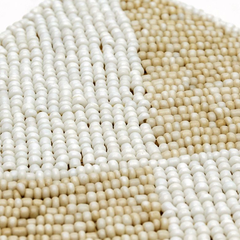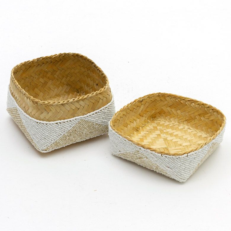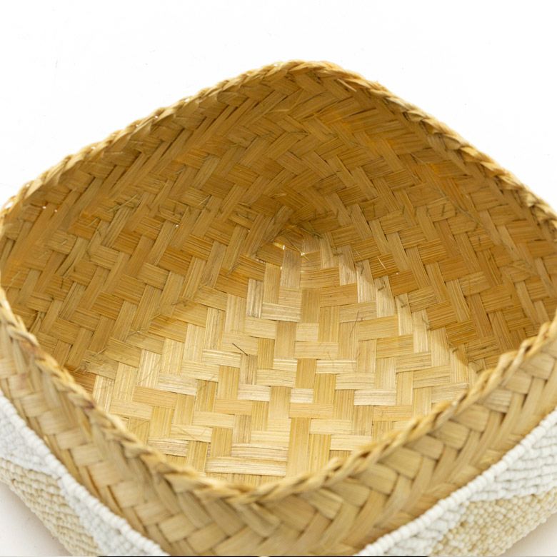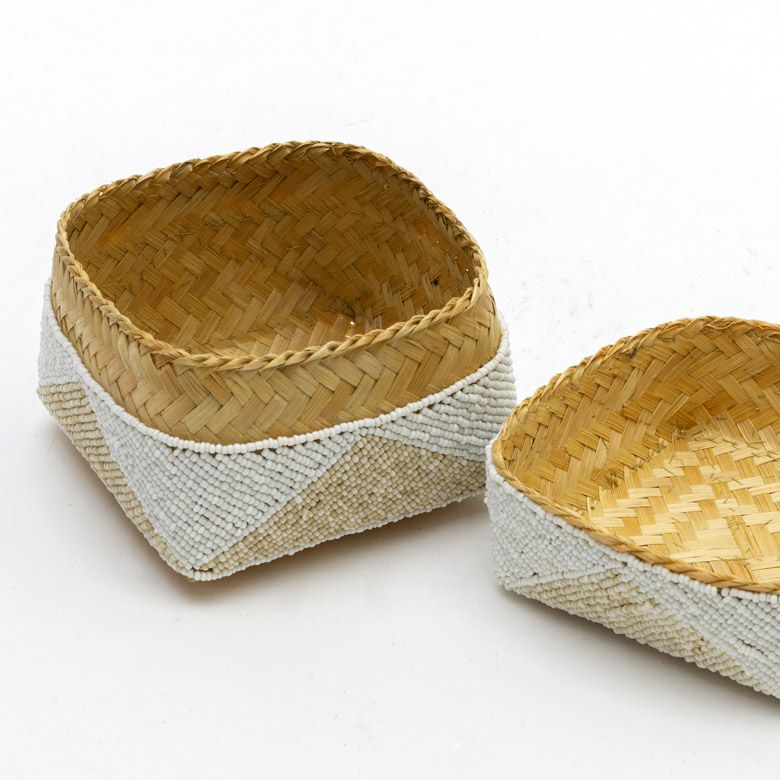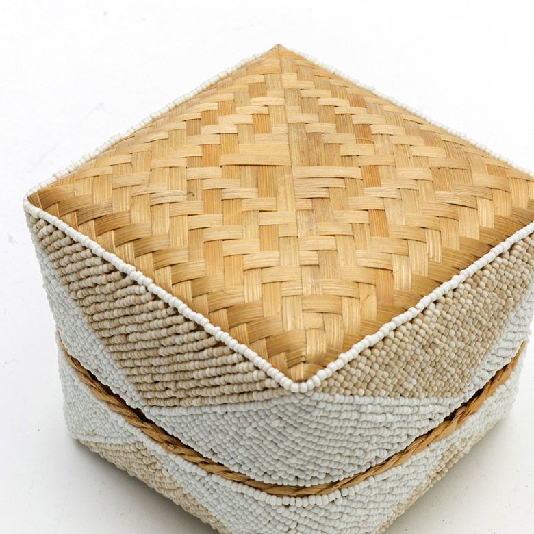 手作業で竹のスライスを編み、贅沢に底以外の全面をビーズでデコレーションした、華やかなアイテムです。
