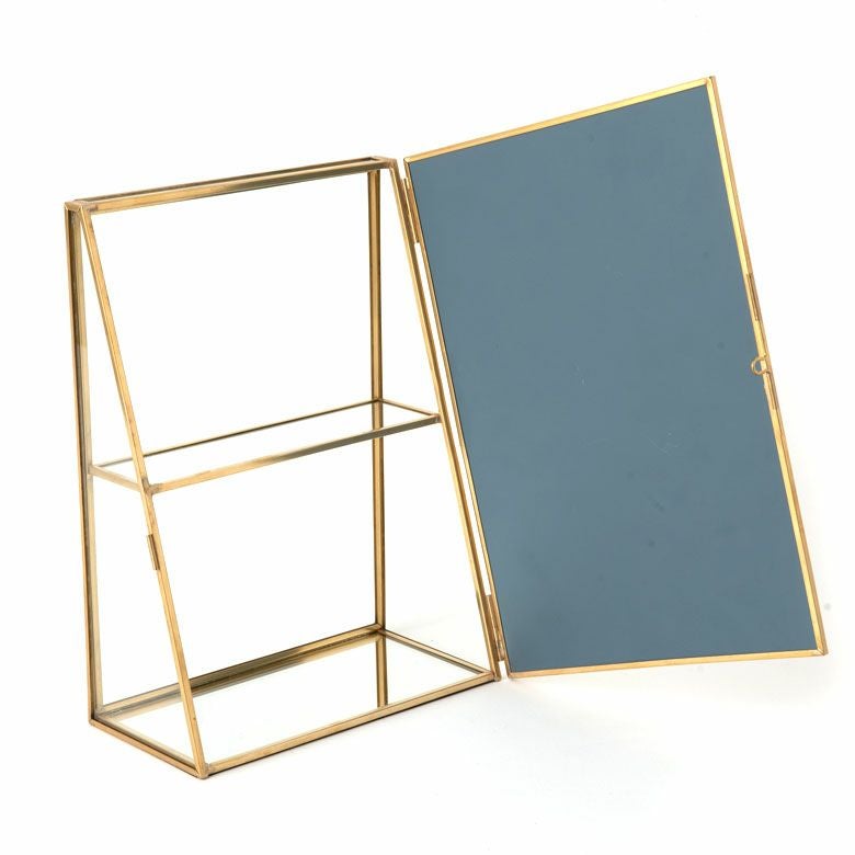 ミラーの扉を開けると、ガラスの収納スペースがあるアクセサリーケース。