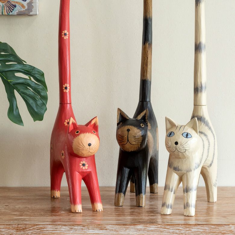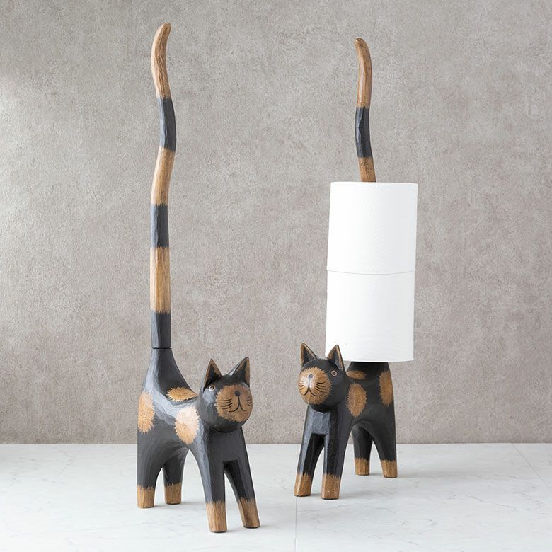 しっぽでトイレットペーパーを持ってくれる木彫りのネコのオブジェ。