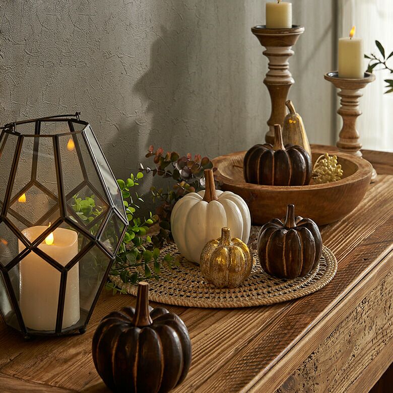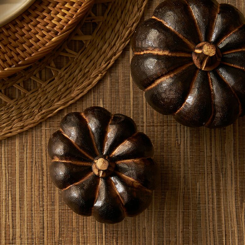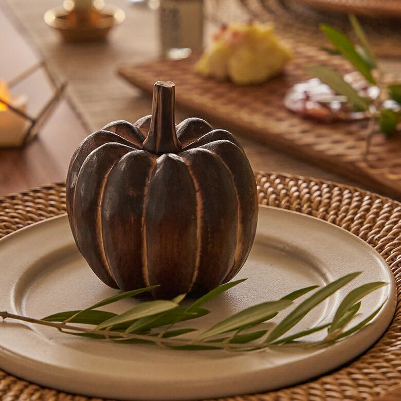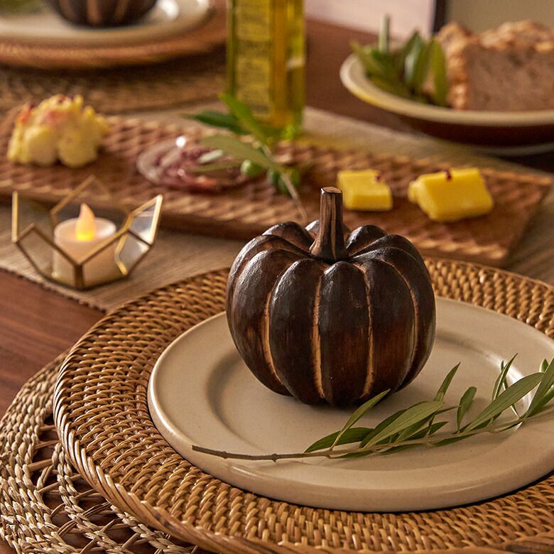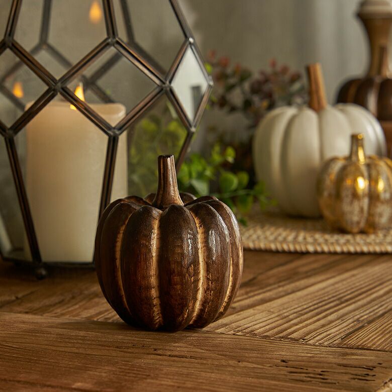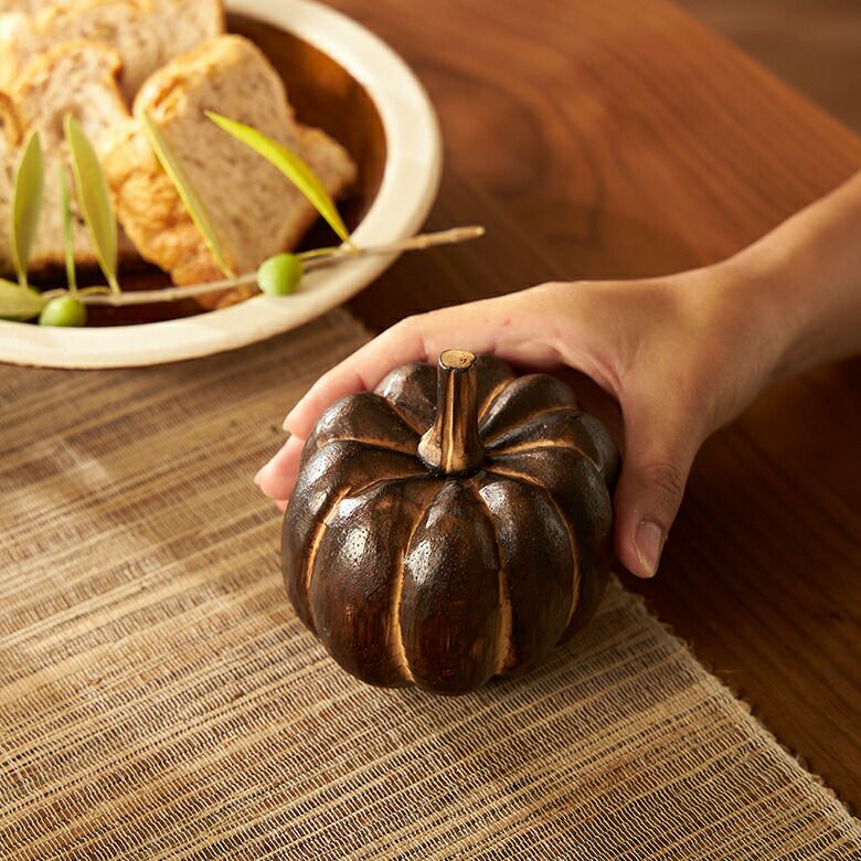 手のひらサイズが可愛らしい、木製のかぼちゃのオブジェ。