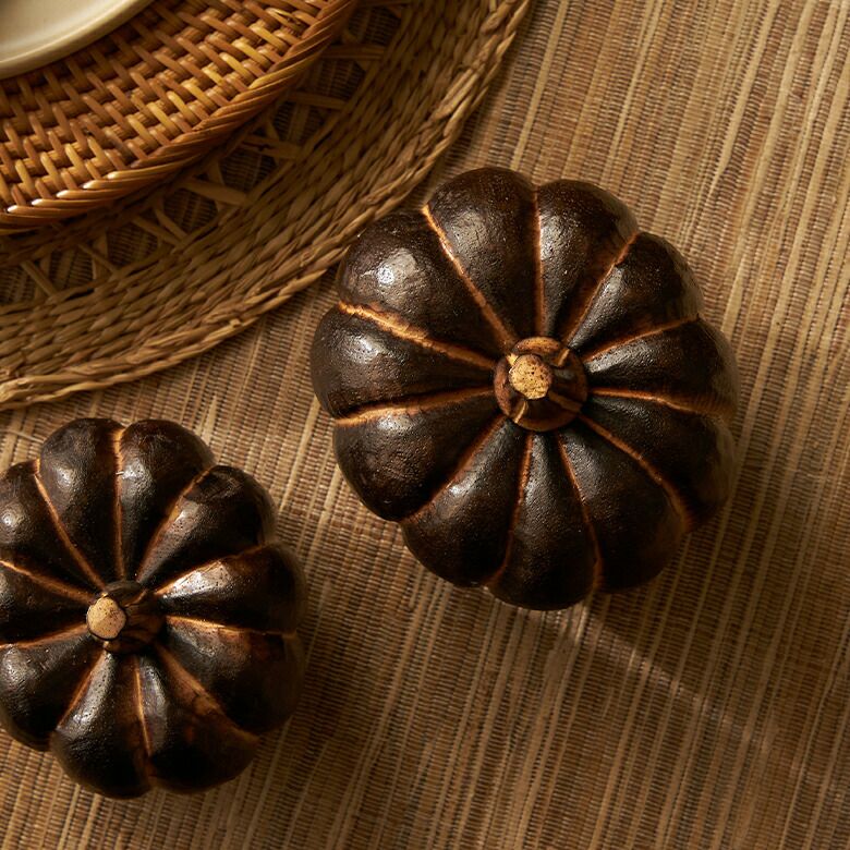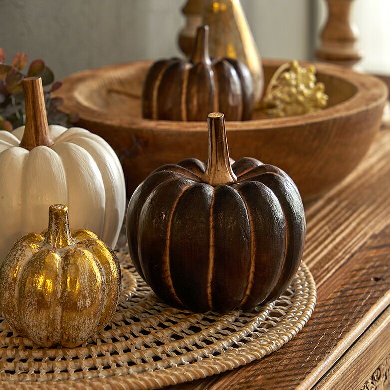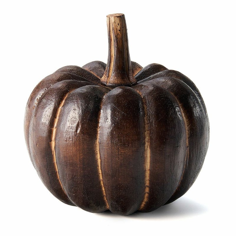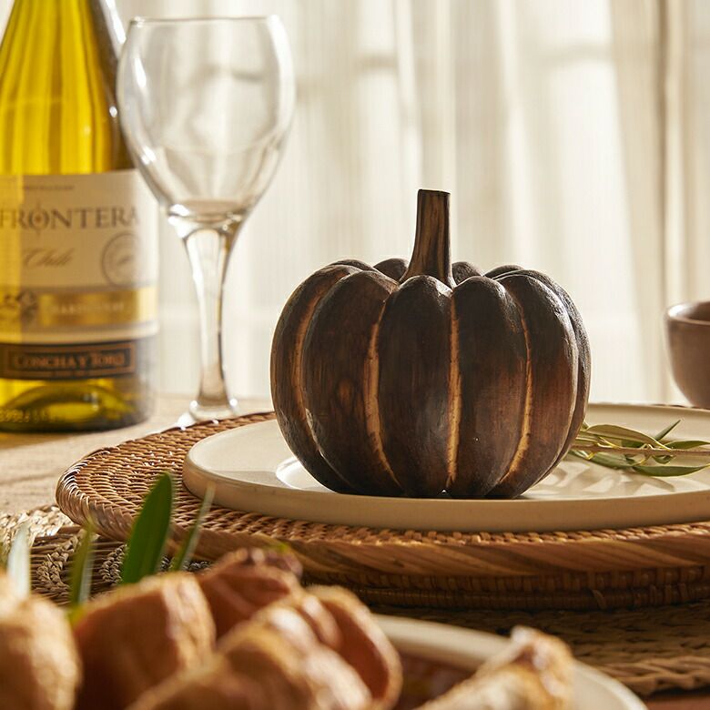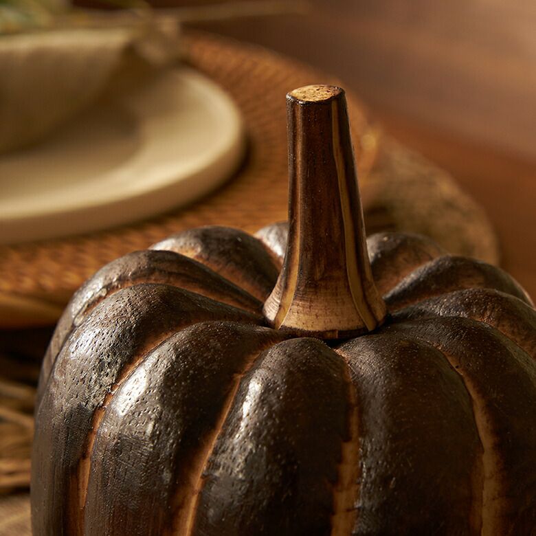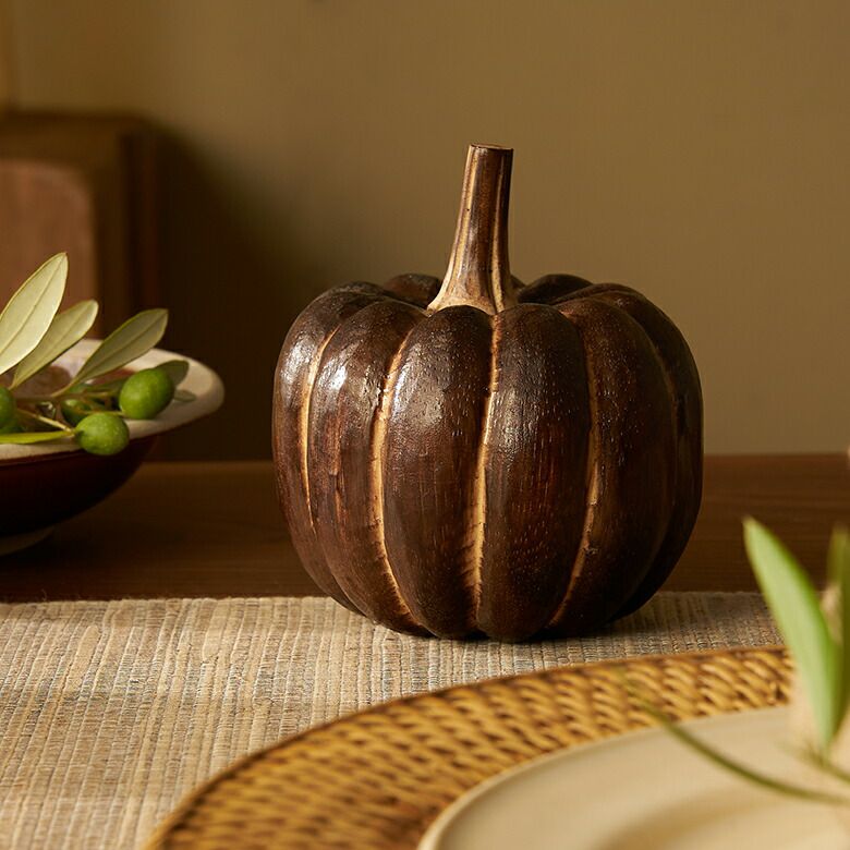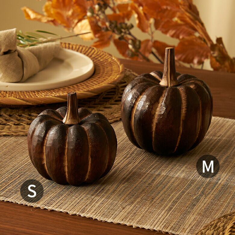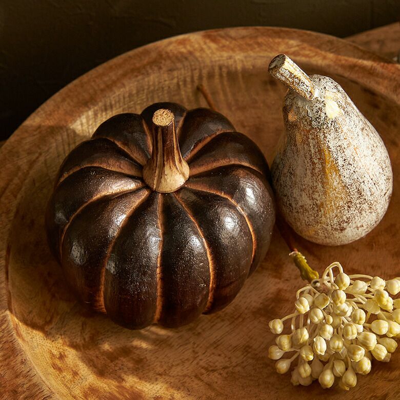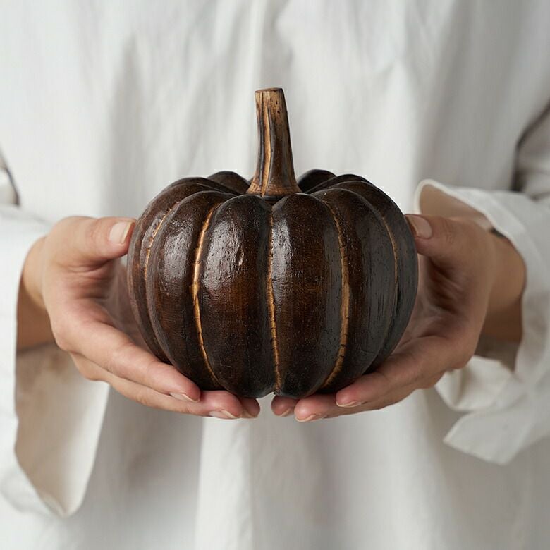 手のひらサイズが可愛らしい、木製のかぼちゃのオブジェ。
