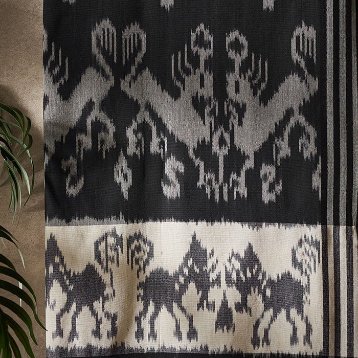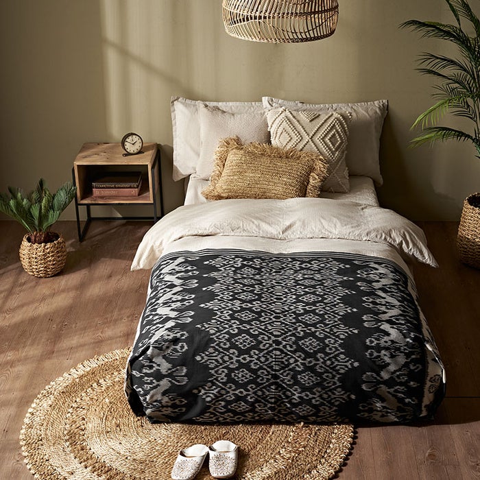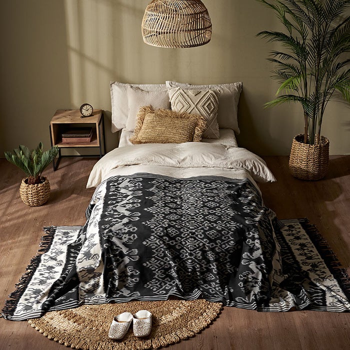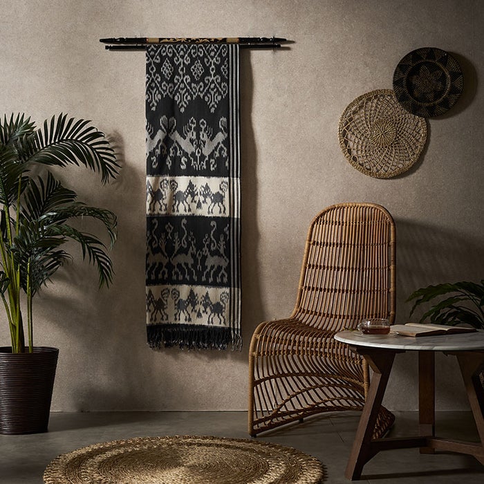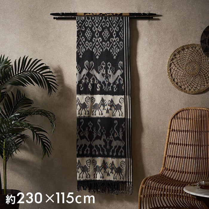 230×115cmと大判のこちらのイカットは、タペストリーのように壁に掛けるのはもちろん、空間の間仕切りとして使ったり、ベットスローやテーブルクロスとしてお使いいいただくのも素敵です。柄がプリントされているタイプの生地と違い、織物ならではの柄の立体感は、飾る空間をより立体的に、奥行きがあるように見せてくれます。単調な柄ではないため、生地の見せる部分によって雰囲気が変わるのも、イカットの面白いところです。